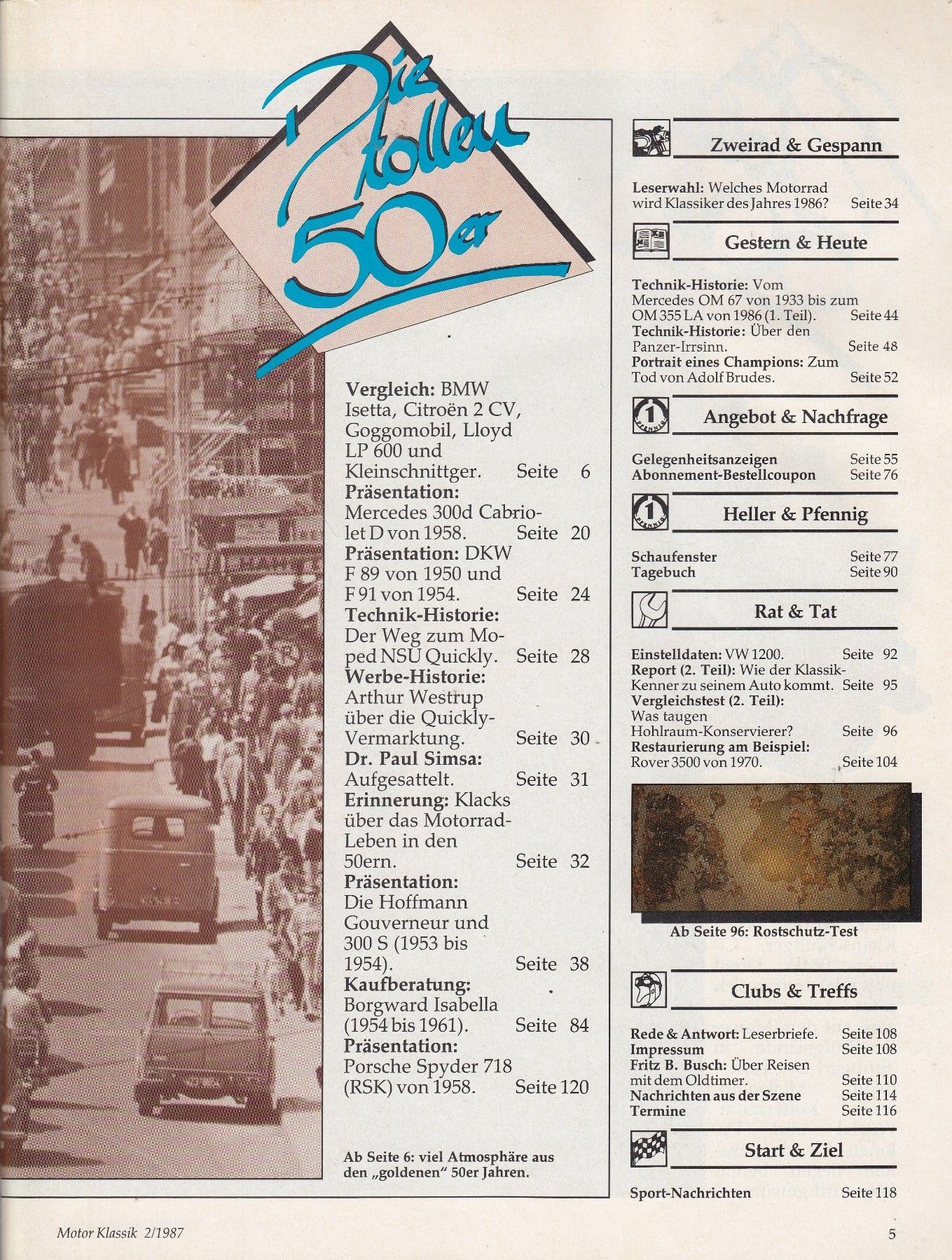 Motor Klassik Heft 2 1987 Vergleich: BMW Isetta, Citroen 2 CV, Goggomobil, Lloyd LP 600, Kleinschnittger Präsentation: Mercedes 300d Cabrio von 1958, DKW F89 und F91, Porsche 718 Spyder RSK Historie: Moped NSU Quickly Kaufberatung: Borgeard Isabella... Mehr