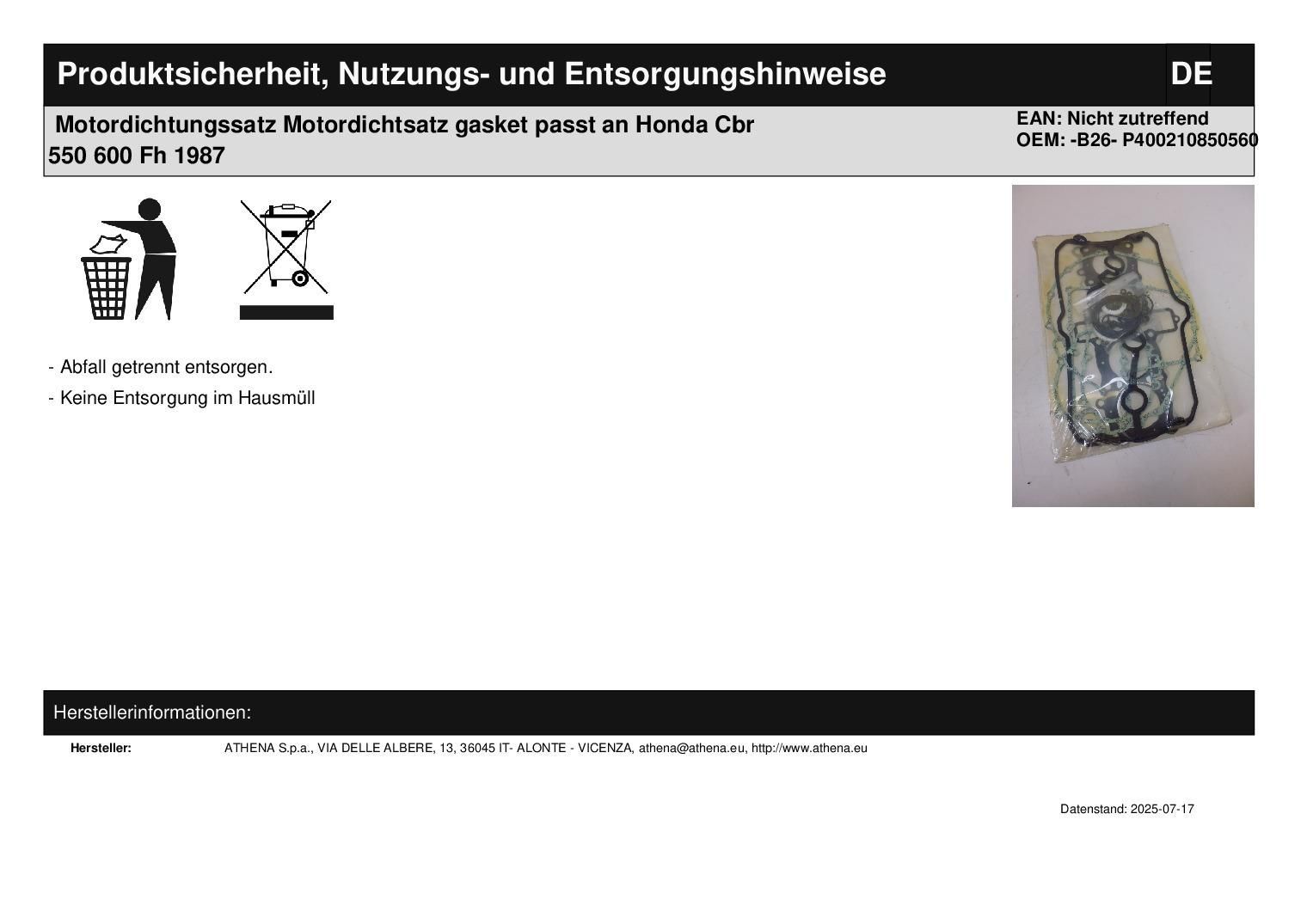 Motordichtungssatz Motordichtsatz gasket passt an Honda Cbr 550 600 Fh 1987