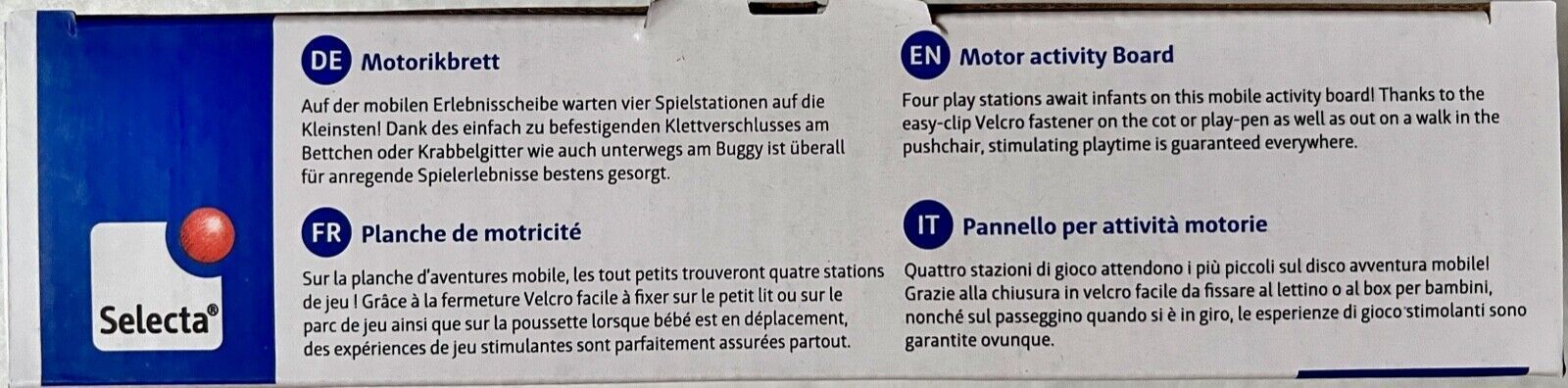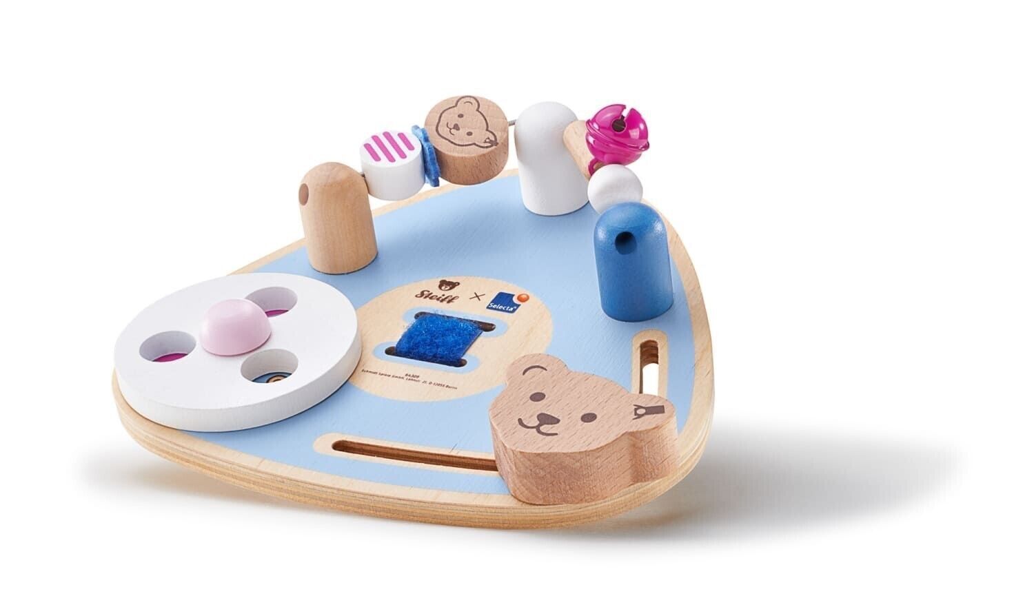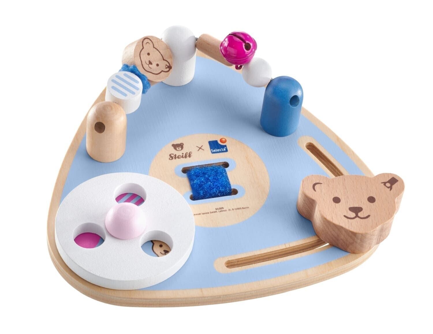 Spieleranzahl 1 Spieler Altersempfehlung: ab 0 Monate STEIFF BY SELECTA® - Motorikbrett aus Holz Auf der mobilen Erlebnisscheibe warten vier Spielstationen auf die Kleinsten! Dank des einfach zu befestigenden Klettverschlusses am Bettchen oder Krabbelgitter wie auch unterwegs am Buggy ist überall fü