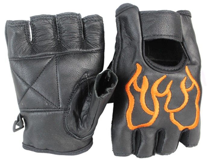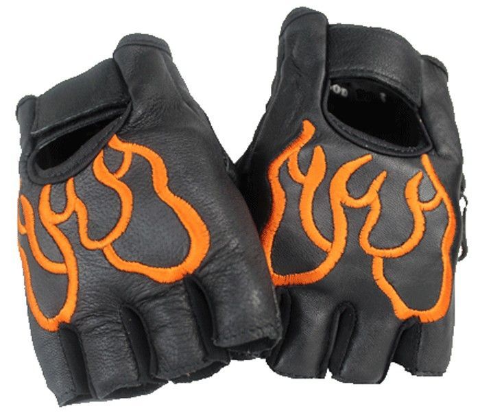 Motorrad BIKER Fingerlose Echt Leder Handschuhe GLOVES Schwarz Flamme Orange
