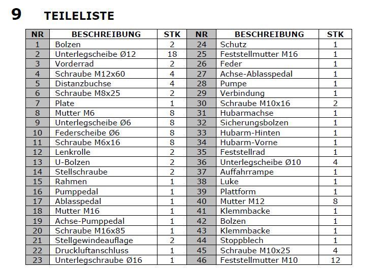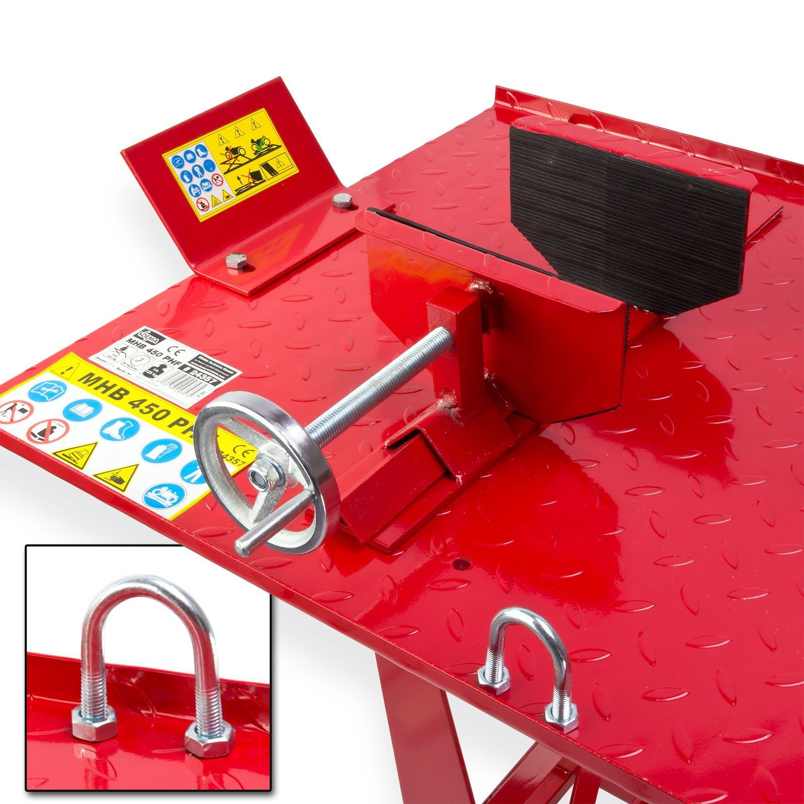 Motorrad Hebebühne 450 kg pneumatisch Motorradhebebühne Mit Ihrer Original DEMA Motorrad Montagerampe 450 kg pneumatisch reparieren Sie fachmännisch Ihr Motorrad, Moped und Roller. Der ideale Helfer für Ihre Werkstatt. Die Bühne benötigt keinen Stromanschluss, sondern funktioniert mittels Hydraulik. Sie ist fahrbar und dadurch flexibel einsetzbar.Ihre neue Montagerampe ist - bei maximaler Flexibilität - sehr robust ausgeführt. Sinnvolle Details runden die Einsatzvielfalt ab.Lieferung erfolgt teilmontiert!Produktmerkmale: Zusätzlicher DruckluftanschlussRutschfestes, stabiles TränenblechBodenstellschrauben gegen unbeabsichtigtes WegrollenFußpedale zum Hochpumpen und AblassenPraktischer RevisionsschachtSicherungsbolzen gegen unbeabsichtigtes AblassenHalteschlaufen für die sichere Befestigung von Zurrgurten (optional erhältlich)Abnehmbare AuffahrrampeSpannvorrichtung für VorderradStabile Metallräder Hinweis: Kontrollieren Sie das Gerät vor Inbetriebnahme auf Vollständigkeit, Funktion und Dichtheit! Lassen Sie die Pumpe mindestens für eine Stunde ruhen, so dass das Öl in der Pumpe zurückfliesen kann. Sollten Sie der Pumpe nicht genügend Ruhezeit geben, dann kann sich noch Luft im Öl befinden. Dies führt dazu, dass Sie die Montagerampe nicht vollständig nach oben pumpen können. Sollte es dennoch nicht möglich sein die Hebebühne ganz hochzuheben, muss der Hubzylinder entlüftet bzw. Hydrauliköl nachgefüllt werden. Technische DatenTragkraft: 450 kgFunktionsart: ParallelhubRevisionsschacht LxB: 76 x 28 cmHubhöhe: von 20 - 84 cmNutzbreite der Bühne: 55 cmDruckluftanschluss: 1/4"Arbeitsdruck: 8,0 - 12,5 BarSpannvorrichtung für Räder bis 17 cm BreiteGesamtmaße LxBxH: 215 cm (277 cm inkl. Rampe) x 64 cm x 84 cm (20 cm Grundzustand)Artikelgewicht: 120 kg