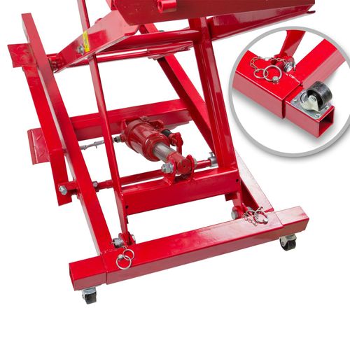 Die Original DEMA Motorradhebebühne mit einer Tragkraft von bis zu 360 kg ermöglicht es Ihnen, kleinere Reparaturen an Motorrädern, Rollern und Fahrrädern selbst durchzuführen und somit Geld zu sparen. Sie ist ideal für Wartungs- und Reparaturarbeiten jeglicher Art geeignet. Die feinfühlige hydraulische Hebe- und Senkeinrichtung ermöglicht das mühelose Bewegen von schweren Lasten bis zur gewünschten Arbeitshöhe. Die Hebebühne arbeitet unabhängig vom Stromanschluss. Die DEMA Motorradhebebühne 360kg ist ein praktischer Helfer, der Zeit, Geld und Nerven spart. Mit Gummiauflagen versehene Backen, eine Sicherung gegen unbeabsichtigtes Absenken, ein stabiler Anschlagwinkel, eine Rampe aus Riffelblech und ein Grundgestell aus 4-Kant-Rohr sorgen für sicheres Arbeiten. Seitlich ausziehbare Lenkrollen bieten erhöhte Standsicherheit. Die Hebe- und Senkbewegungen erfolgen durch einen Fußhebel, und ausziehbare Räder ermöglichen einen einfachen Standortwechsel. Die Auffahrrampe ist abnehmbar und kann praktisch verstaut werden. Eine Kurbelgesteuerte Spannvorrichtung gewährleistet festen Halt. Die Produktdaten umfassen eine Tragkraft von bis zu 360 kg, eine maximale Hubhöhe von bis zu 830 mm und eine minimale Hubhöhe (Auffahrhöhe) von 200 mm. Arretierbare Arbeitshöhen sind bei 53 und 77 cm möglich. Die Gesamtlänge inklusive Auffahrblech beträgt 2200 mm, während die nutzbare Länge ohne Auffahrblech 1400 mm beträgt. Die Backenöffnung ermöglicht das Arbeiten mit Gegenständen von bis zu 150 mm Breite. Die Breite der Rampe beträgt 495 mm. Die Hebebühne ist in auffälligem Rot gehalten und wiegt insgesamt 97 kg. Die DEMA Motorradhebebühne 360kg bietet eine zuverlässige und bequeme Möglichkeit, Reparatur- und Wartungsarbeiten an motorisierten Zweirädern durchzuführen. Produktmerkmale: Backen mit GummiauflageSicherung gegen unbeabsichtigtes AbsenkenStabiler AnschlagwinkelRampe aus RiffelblechGrundgestell aus 4-Kant-RohrLenkrollen seitlich ausziehbar für mehr StandsicherheitHeben und Senken durch Fußhebel.Ausziehbare Räder für einen leichten und sichern Standort WechselAuffahrrampe ist zum praktischen Verstauen abnehmbarSpannvorrichtung mit Kurbel Lieferumfang: 1x Motorrad Hebebühne / Motorradhebebühne, bis 360kg, hydraulisch Hinweis: Lieferung erfolgt teilmontiert!Zum sicheren Arbeiten darf die Bühne nur in den zwei rastbaren Arbeitshöhen von 53 und 77 cm verwendet werden. Allein in diesen zwei Stellungen ist der Zylinder entlastet und ein unbeabsichtigtes Senken nicht möglich. Hinweis: Kontrollieren Sie das Gerät vor Inbetriebnahme auf Vollständigkeit, Funktion und Dichtheit! Lassen Sie die Pumpe mindestens für eine Stunde ruhen, so dass das Öl in der Pumpe zurückfliesen kann. Sollten Sie der Pumpe nicht genügend Ruhezeit geben, dann kann sich noch Luft im Öl befinden. Dies führt dazu, dass Sie die Montagerampe nicht vollständig nach oben pumpen können. Sollte es dennoch nicht möglich sein die Hebebühne ganz hochzuheben, muss der Hubzylinder entlüftet bzw. Hydrauliköl nachgefüllt werden.