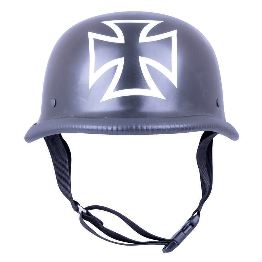 Matt Schwarz Eisene Kreuz Halb-schale Helme aus Fiber Glas Deutsche Helm mit Druck Taster verschließbar Sehr Hoch Qualität Sie Können diese den Helm lange Tragen, ohne sich unwohl zu fühlen Angenehme und Bequem zu Fahren Die eignet sich zum Motorrad Fahren, Biker und Freizeit Aktivitäten Größen XXS