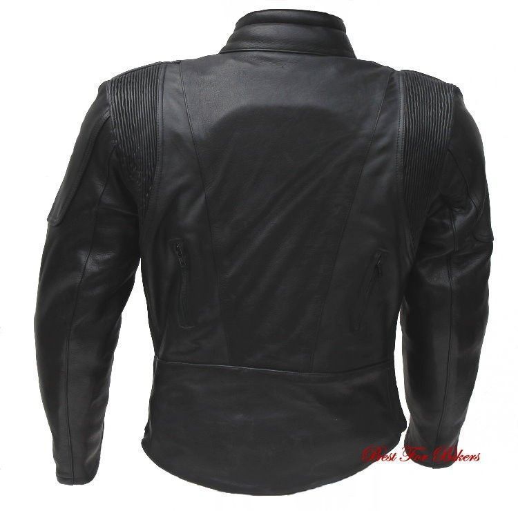 Leder-Motorradjacke Racing, Lederjacke mit herausnehmbarem Innenfutter. Schutzeinsätze an Schulter, Ellenbogen und Rücken (alles austauschbar) Weitenverstellung durch 2 versetzte Front-Reißverschlüsse Lüftungsreißverschlüsse Farbe:schwarz. Außenmaterial: 100 % Rindleder, Netzinnenfutter 100 % Polyamid, herausnehmbares Innenfutter 100 % Polyester