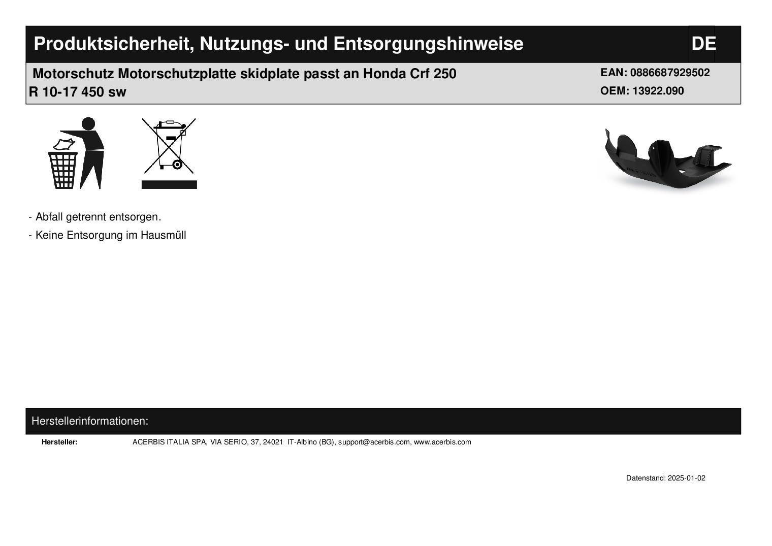 Acerbis Motorschutz Motorschutzplatte skidplate passt an Honda Crf 250 R 10-17 450 sw
