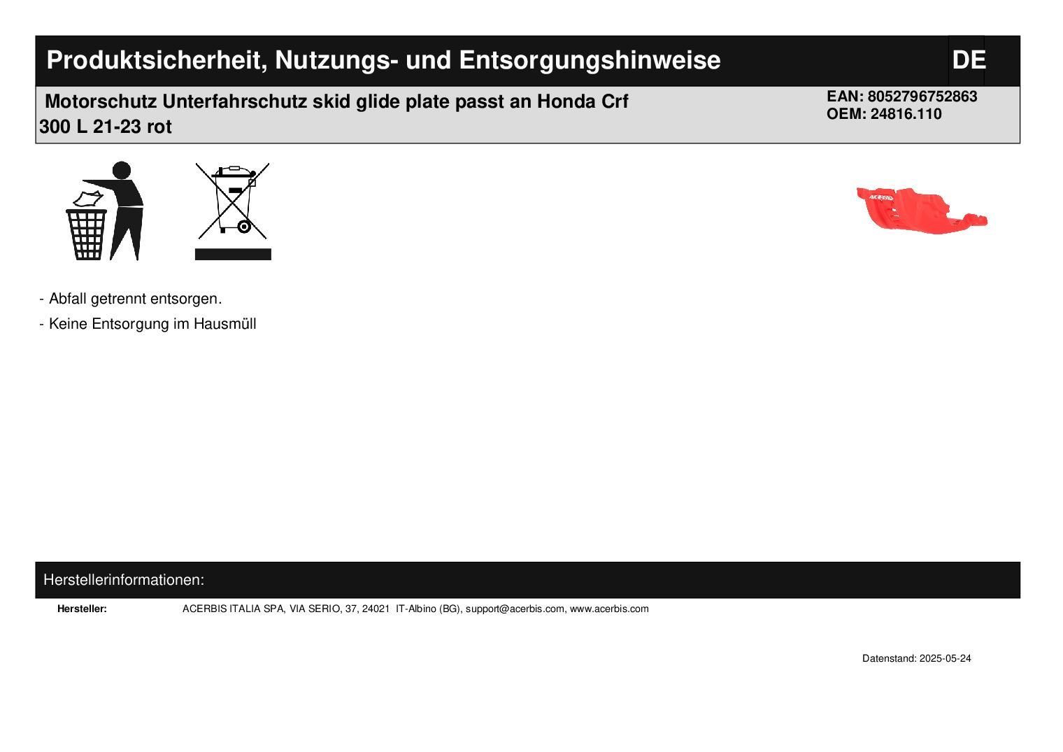 Acerbis Motorschutz Unterfahrschutz skid glide plate passt an Honda Crf 300 L 21-23 rot