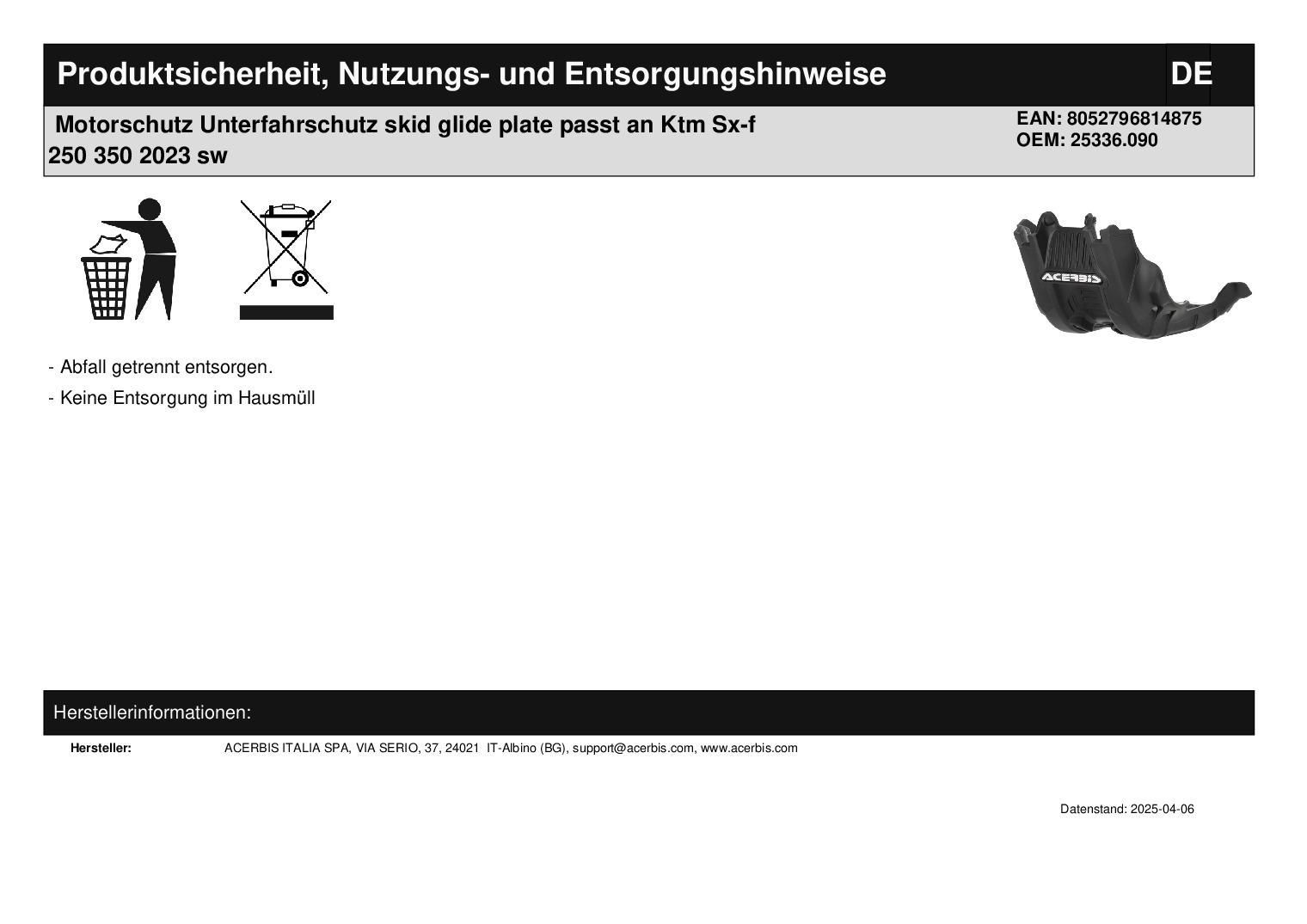 Acerbis Motorschutz Unterfahrschutz skid glide plate passt an Ktm Sx-f 250 350 2023 sw