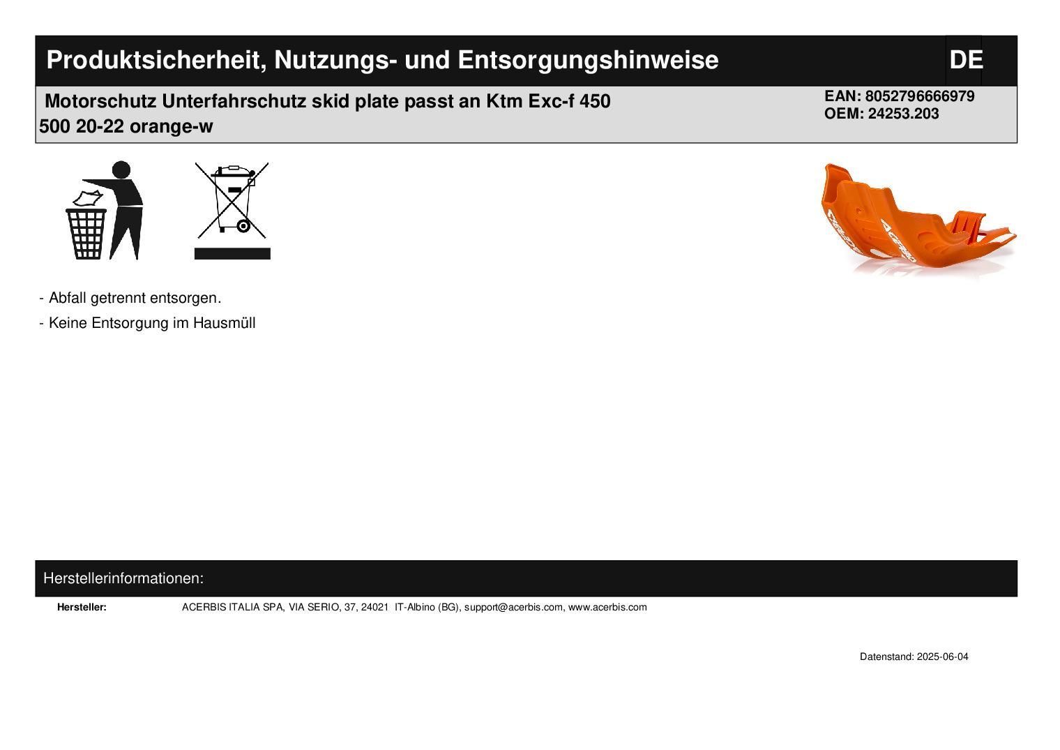 Acerbis Motorschutz Unterfahrschutz skid plate passt an Ktm Exc-f 450 500 20-22 orange-w