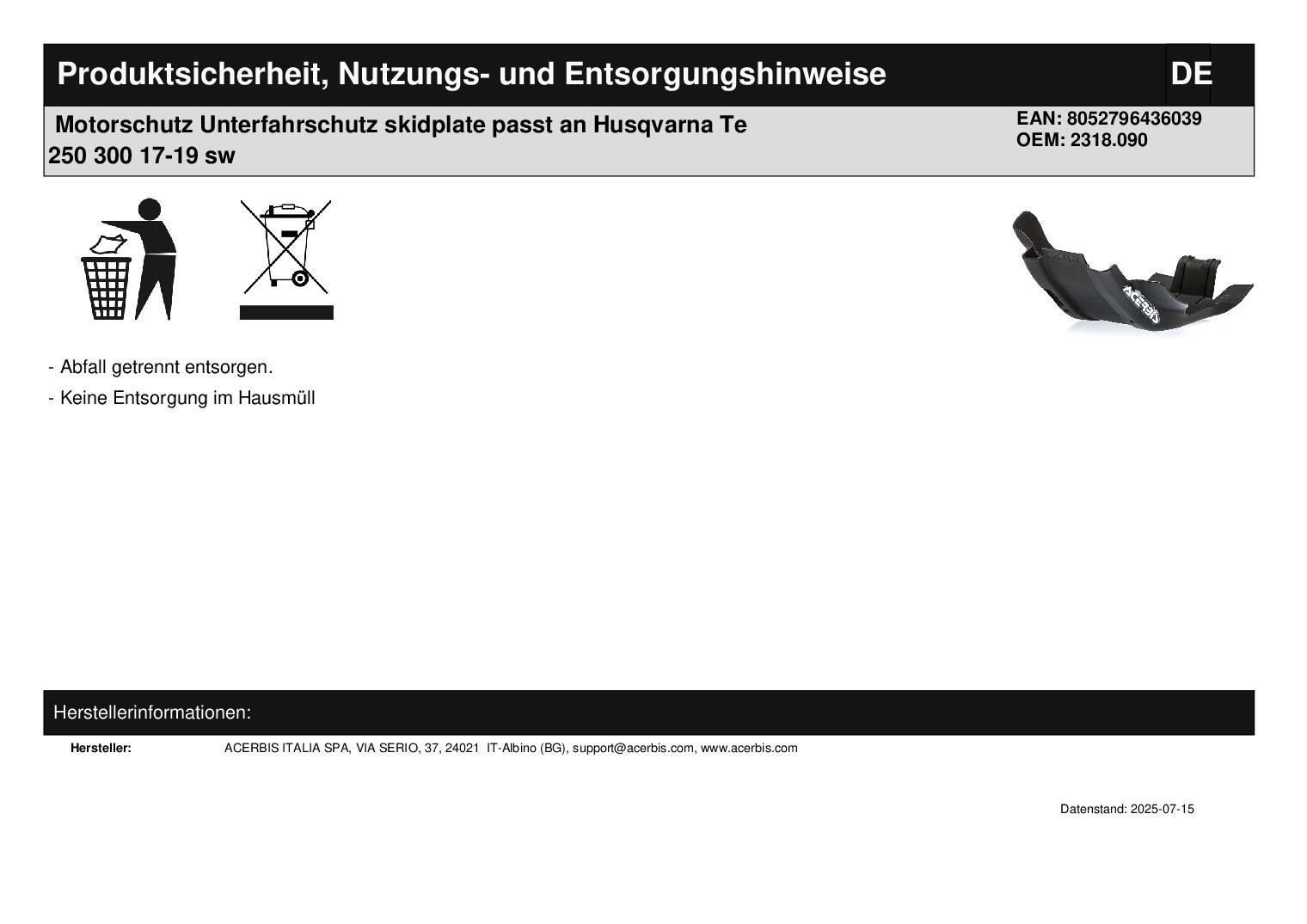 Acerbis Motorschutz Unterfahrschutz skidplate passt an Husqvarna Te 250 300 17-19 sw