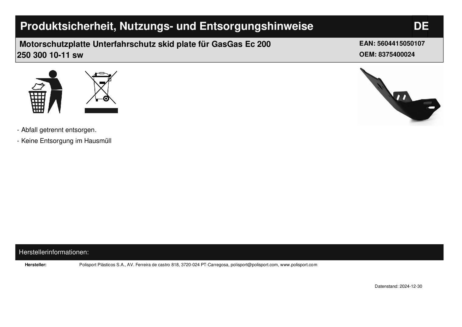 Polisport Motorschutzplatte Unterfahrschutz skid plate passt an GasGas Ec 200 250 10-11 sw