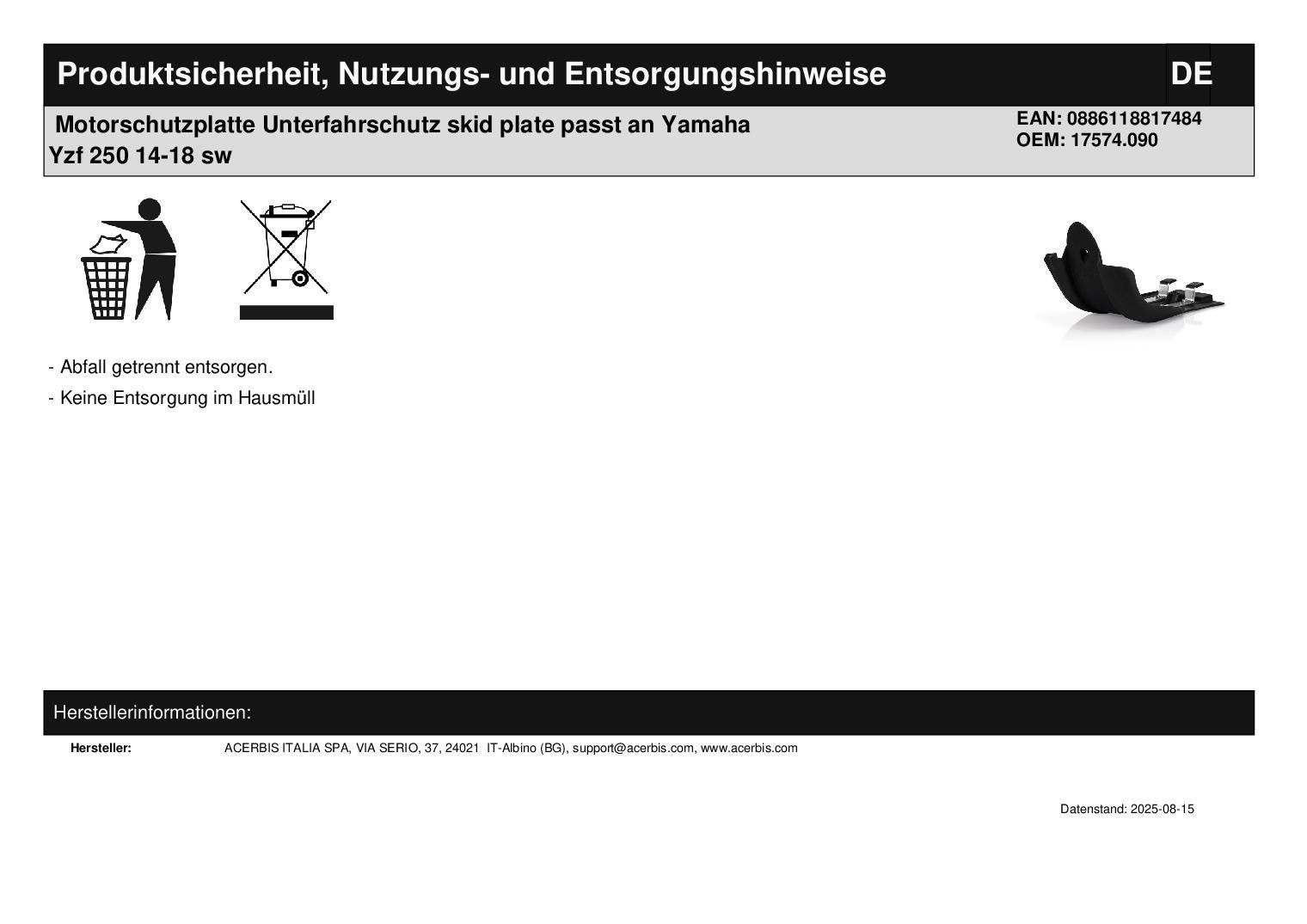 Acerbis Motorschutzplatte Unterfahrschutz skid plate passt an Yamaha Yzf 250 14-18 sw