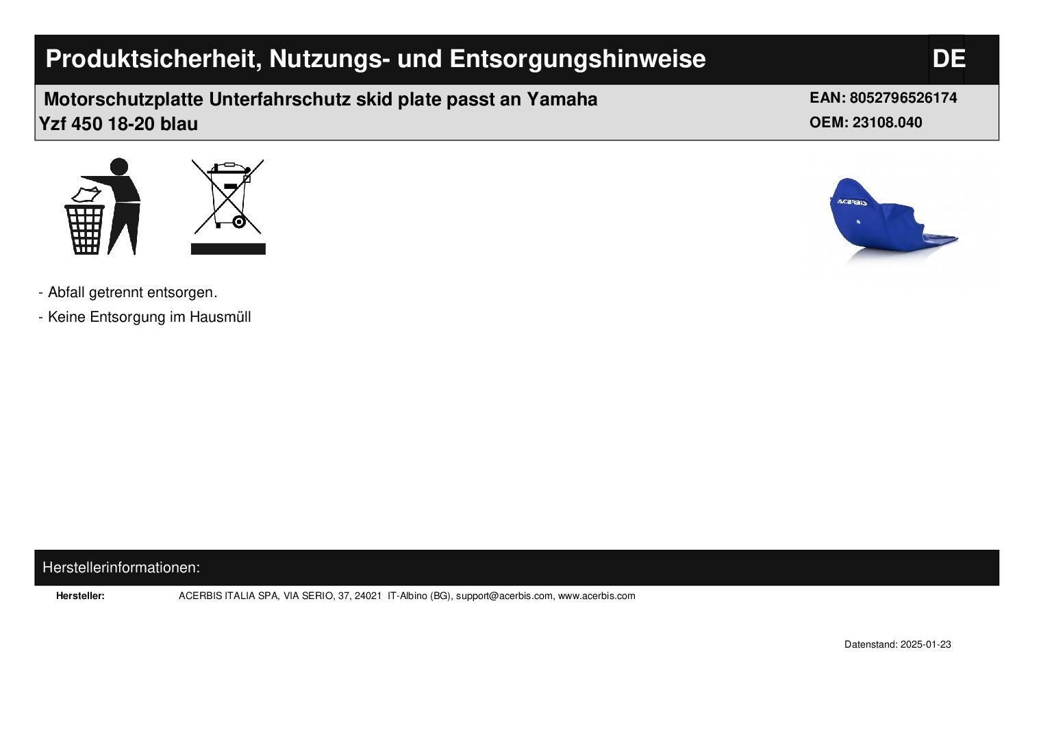 Acerbis Motorschutzplatte Unterfahrschutz skid plate passt an Yamaha Yzf 450 18-20 blau