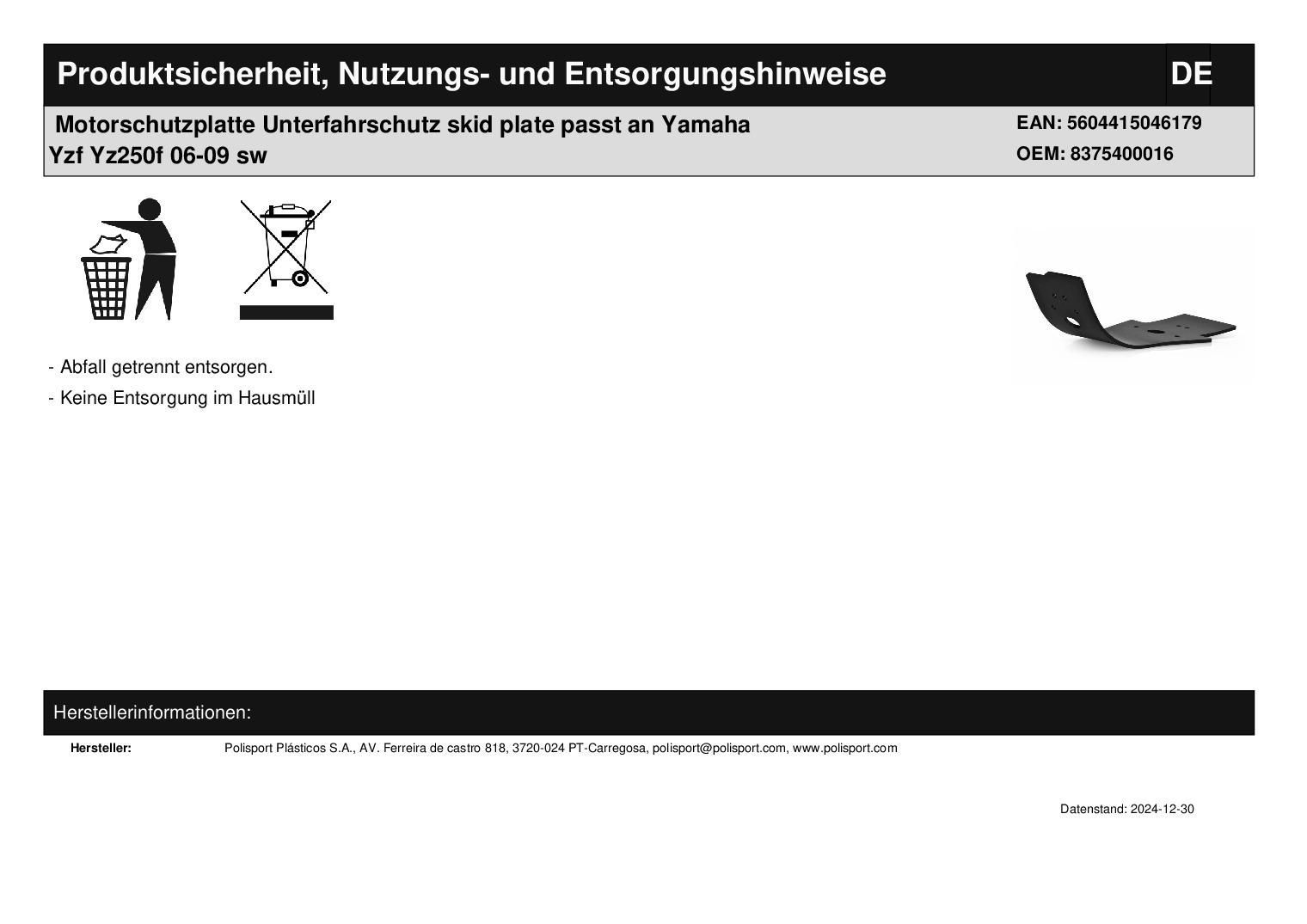 Polisport Motorschutzplatte Unterfahrschutz skid plate passt an Yamaha Yzf Yz250f 06-09 sw