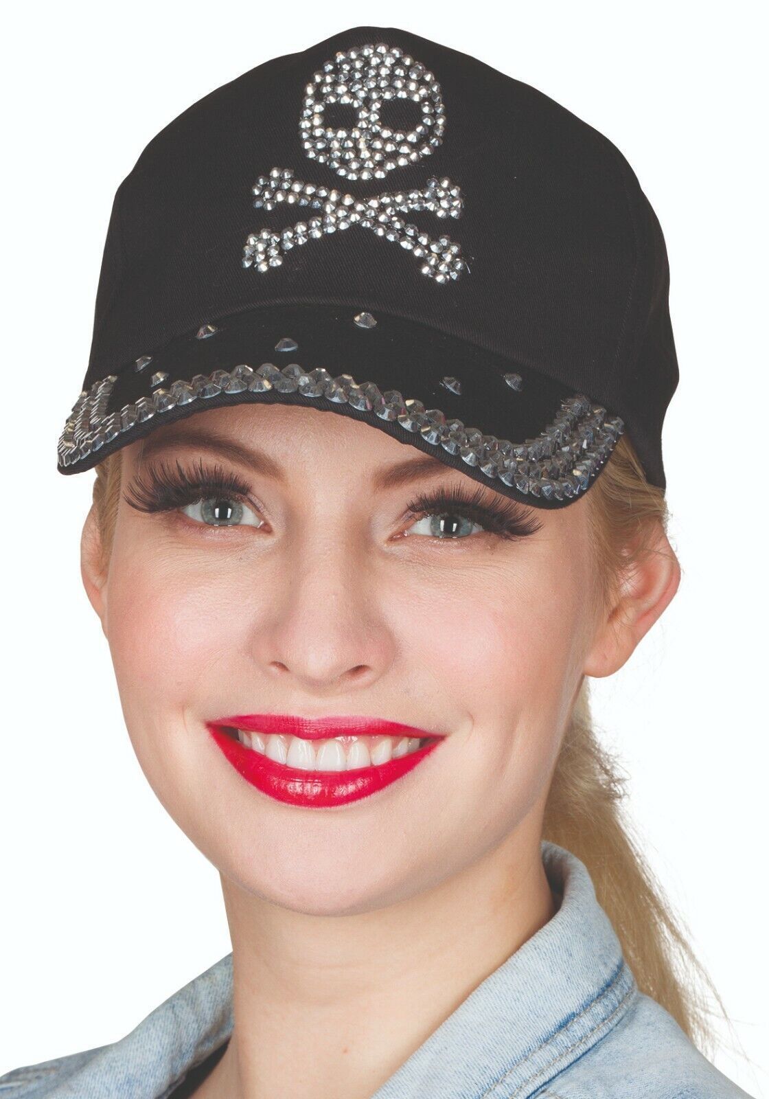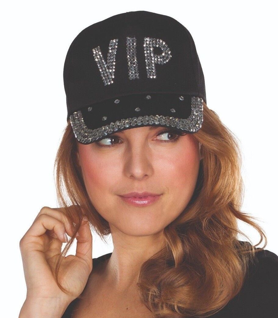Strass Cap Schwarze Baseball-Kappe mit Schirm, die mit silbernen Nieten verziert ist. Auf der Vorderseite bilden die Strass-steine das Kürzel VIP oder FBI. oder wählen Sie die Schwarze Schirmmütze, auf deren Vorderseite ein Totenkopfmotiv aus Nieten angebracht ist. Der Schirm ist ebenfalls mit Niete