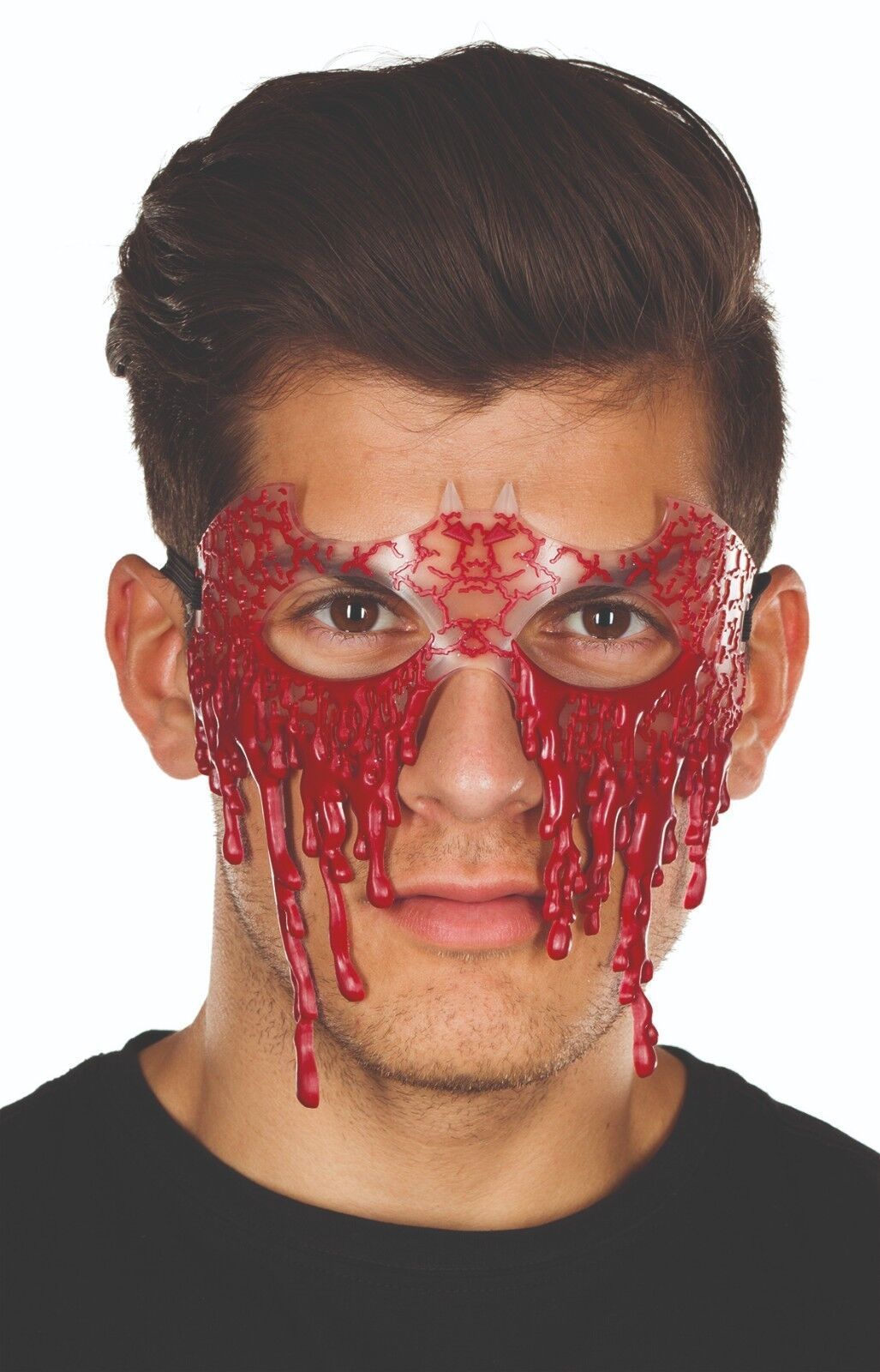 Blutige Maske von Mottoland Beinhaltet Transparente Latexmaske in Fledermaus-Form, die mit einem Gitternetz aus Blut überzogen ist, das in langen dicken Fäden herabhängt. Ideal für K A R N E V A L , F A S C H I N G , H A L L O W E E N oder PARTYS :) Weitere Kostüme, Schminke und Zubehör, gibt es in