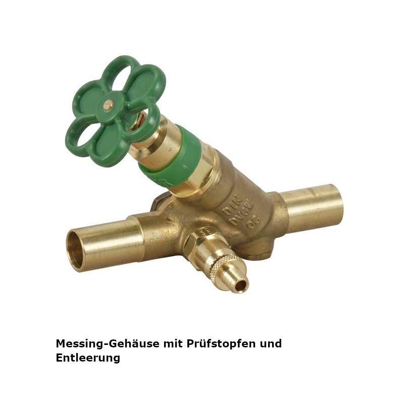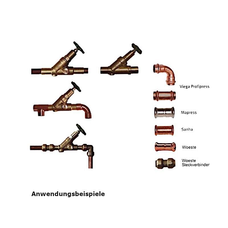 • Messing KFR-Ventil 15-28mm • Press, Steck- und Lötanschluss • mit Entleerung und Prüfstopfen • Absperrventil DVGW geprüft