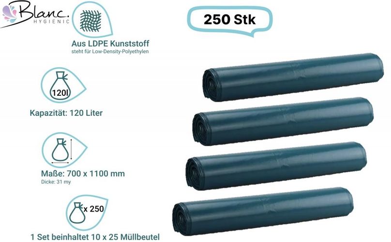 Müllsack hohe Qualität 120 Liter, blau, 31my, extra reißfest, 250 Beutel je SET