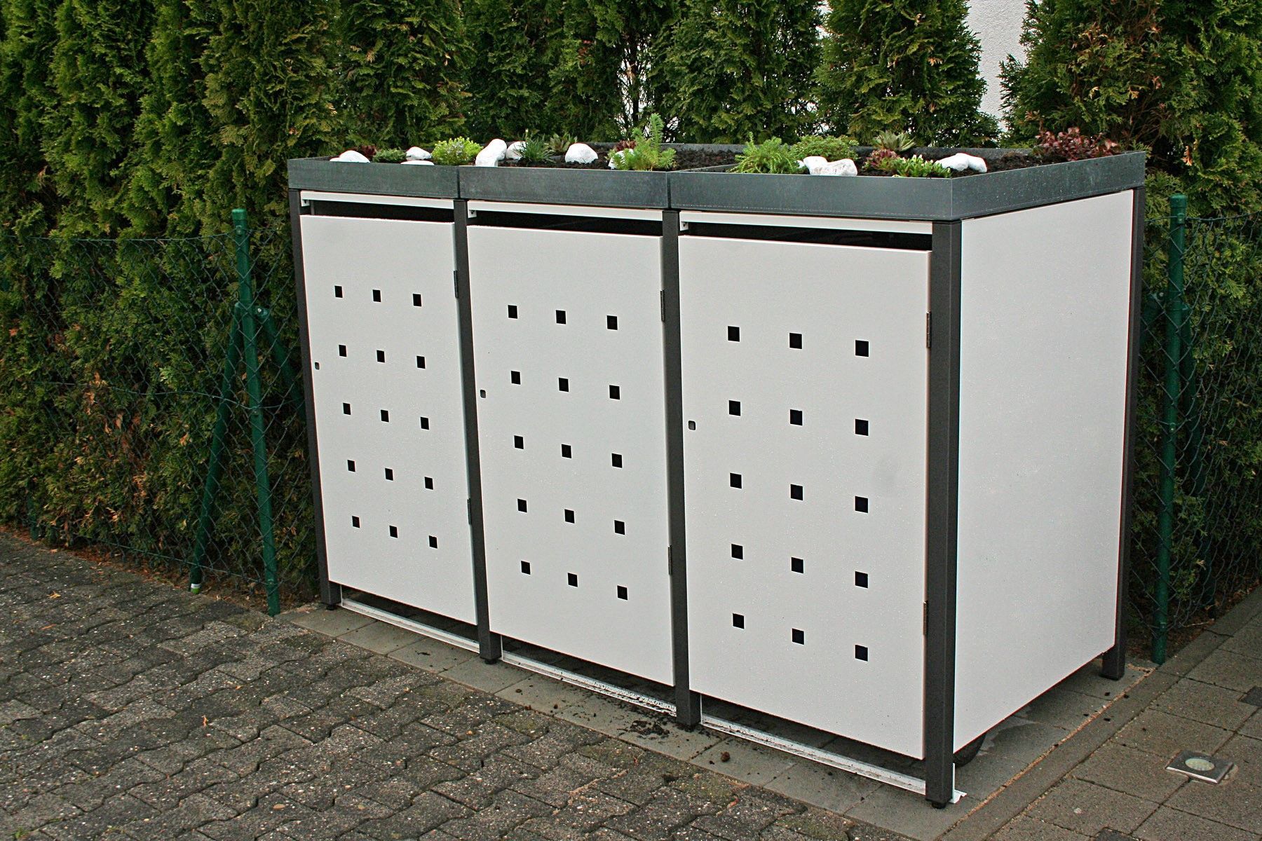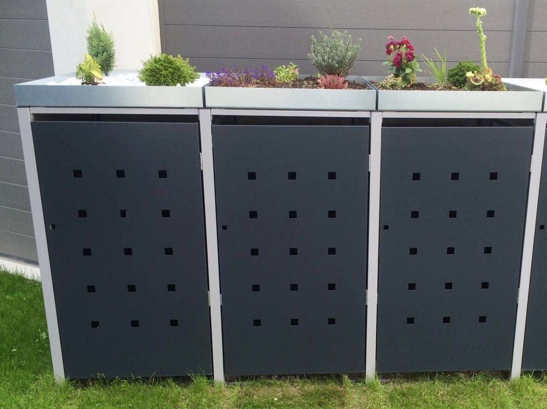 3er Mülltonnenbox aus Metall beschichtet Pflanzdach - in Deutschland hergestellt