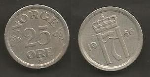 Münze Norwegen: 25 Öre 1956