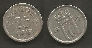 Münze Norwegen: 25 Öre 1957