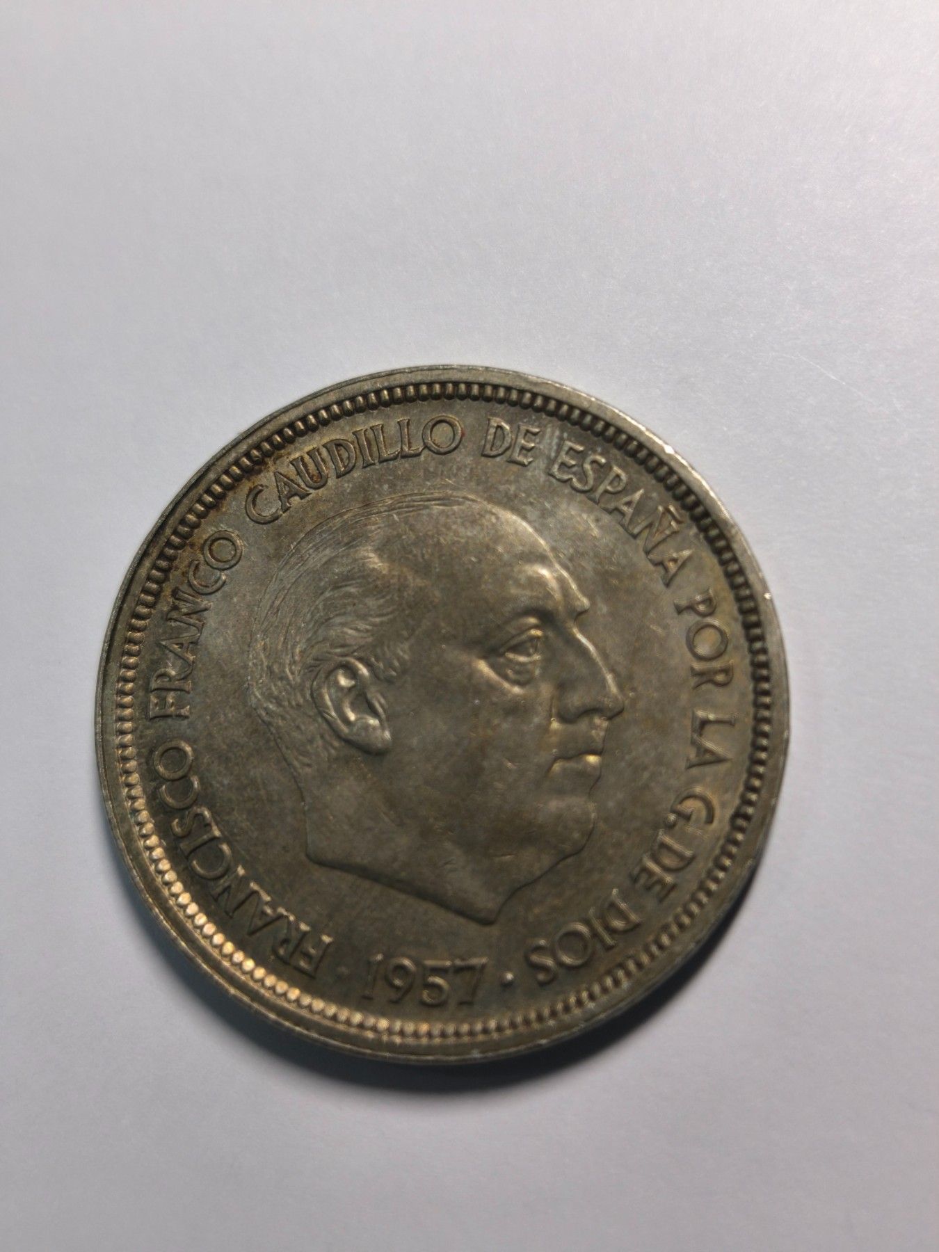 Tauchen Sie in die Geschichte Spaniens ein mit dieser beeindruckenden Münze aus dem Jahr 1957, geprägt zu Ehren Francisco Francos. Ein wahres Sammlerstück, das die europäische Numismatik bereichert. Die Münze in gutem Erhaltungsgrad spiegelt eine Ära wider, die in Europa ihre Spuren hinterlassen hat