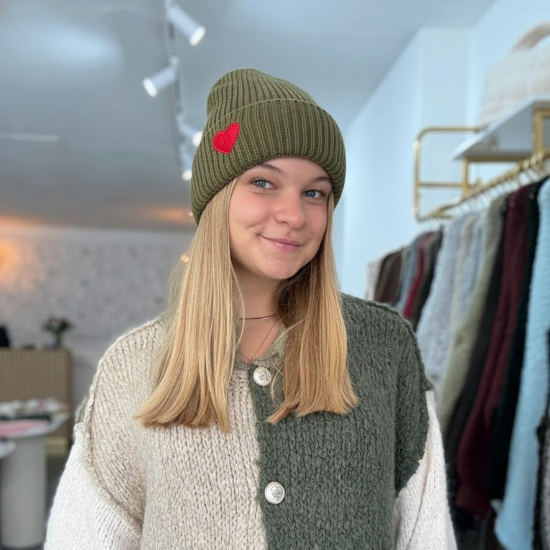 Mütze Herzstickerei Leonie Olivgrün Damen Mützen Frauen Strickmütze Frau Beanie
