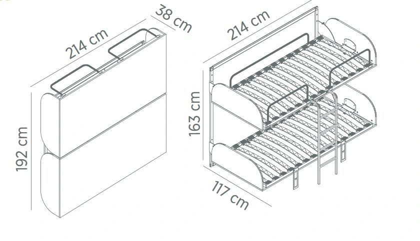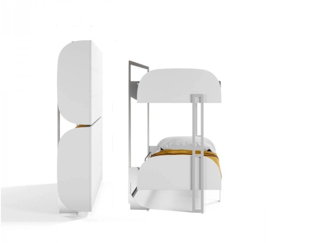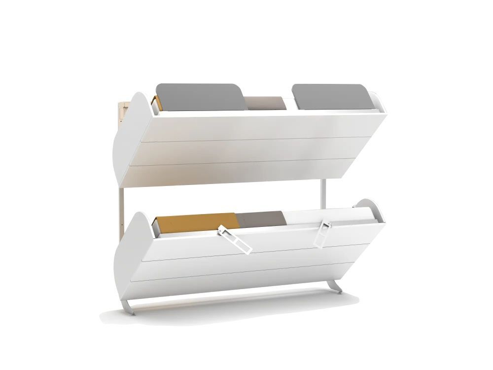 Multimo SIMPLE Etagenbett, 90x200 cm Das Etagenbett besteht aus zwei klappbaren Wandbetten mit robustem Aluminiumrahmen und integrierter Absturzsicherung. Der bequeme Leiter aus Metall erleichtert den Zugang zum oberen Bett. Beide Betten verfügen über integrierte Lattenroste und je ein Spanngurt zur