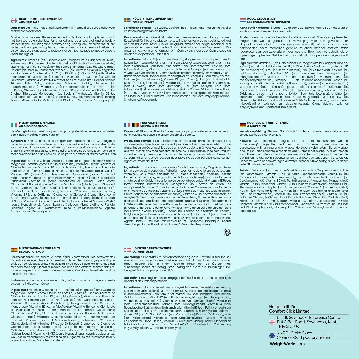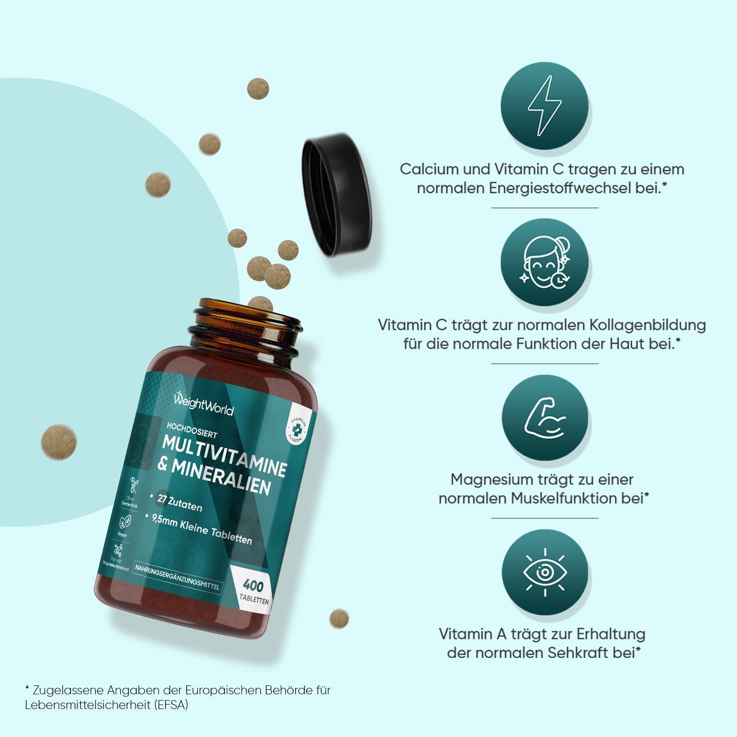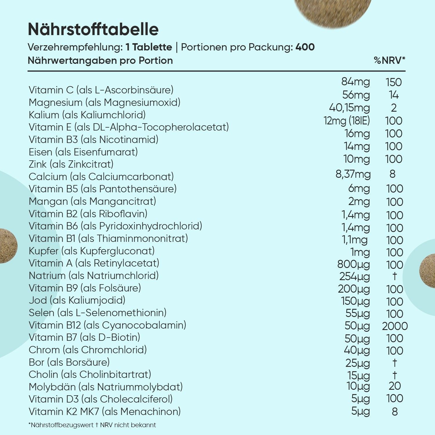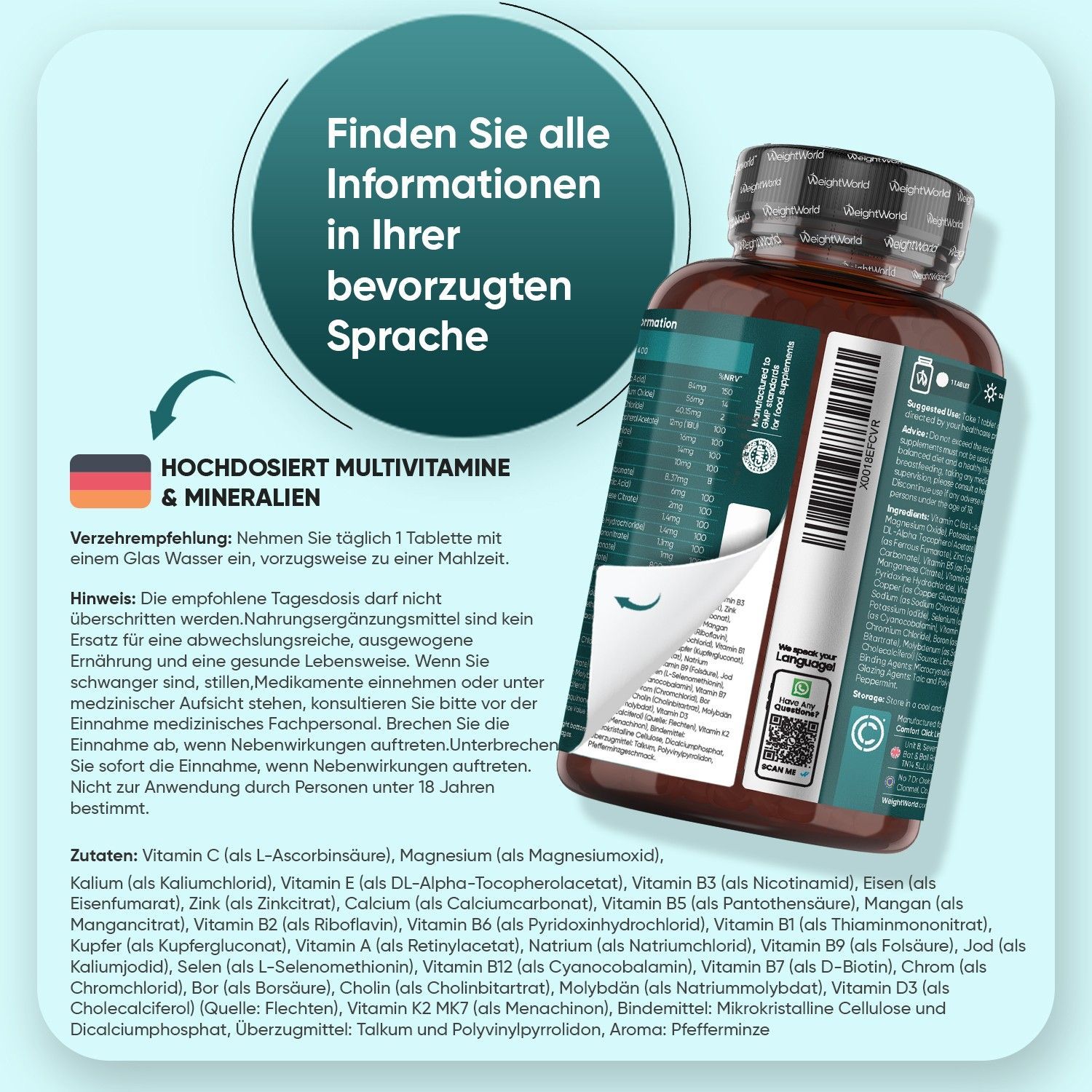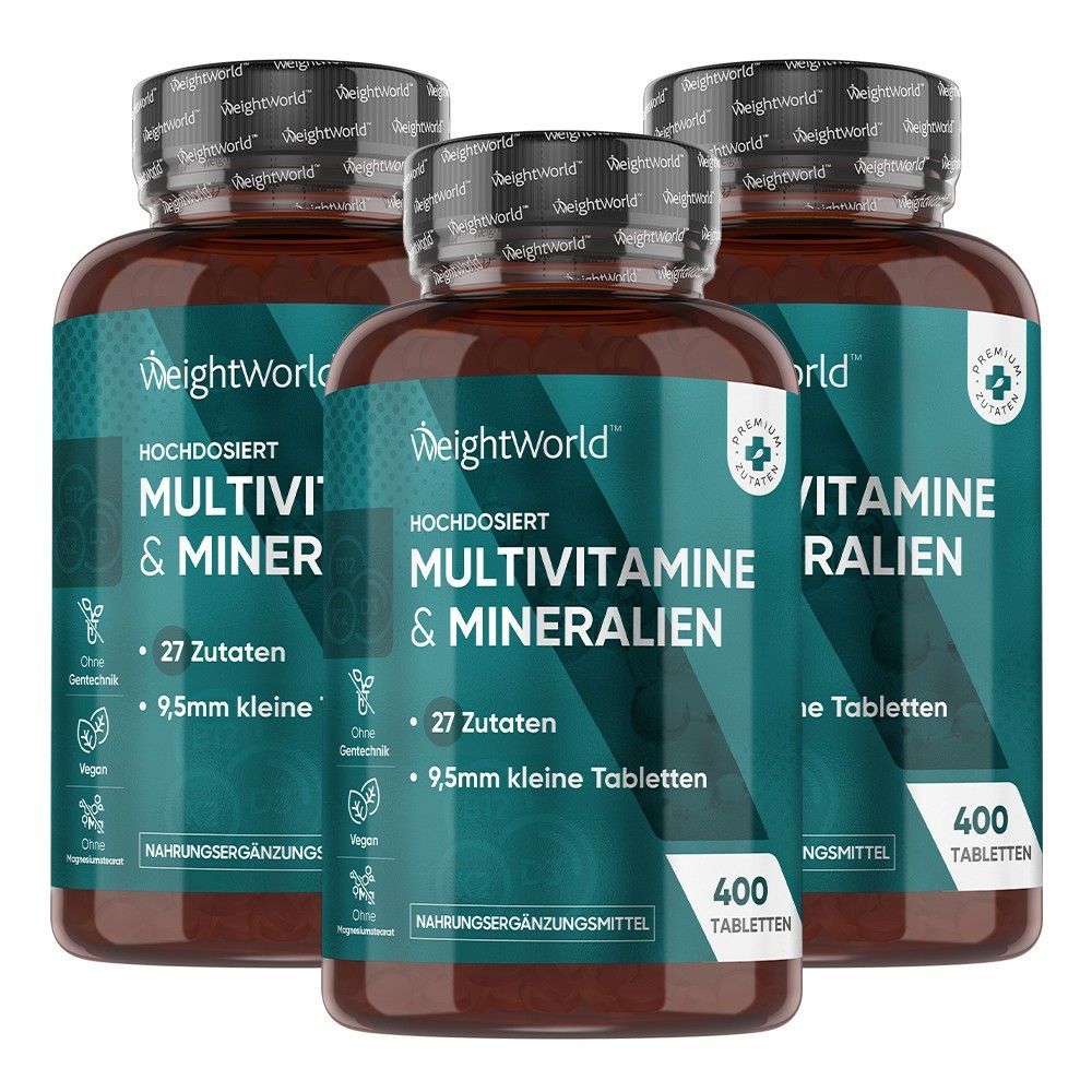 27 Zutaten - Die Multivitamin Tabletten halten mehr als 1 Jahr und enthalten 27 Zutaten wie Vitamin A, B Komplex, Biotin, Vitamin C, Vitamin D3, Vitamin E, Vitamin K, Folsäure, Vitamin B12, Eisen, Magnesium, Kalzium, Selen, Chrom, Kupfer, Jod, Bor, Cholin und Zink. Nehmen Sie täglich 1 Tablette mit einem Glas Wasser und zu einer Mahlzeit ein.