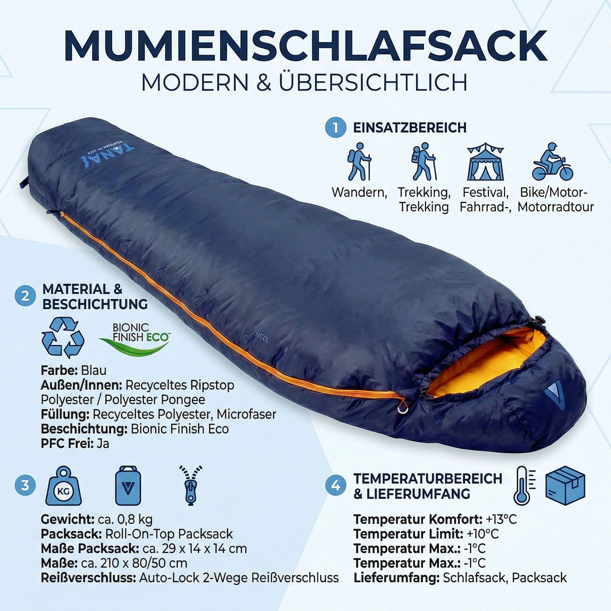 Mumienschlafsack Neel Blau 800g Sommer Schlafsack Trekking Backpacking