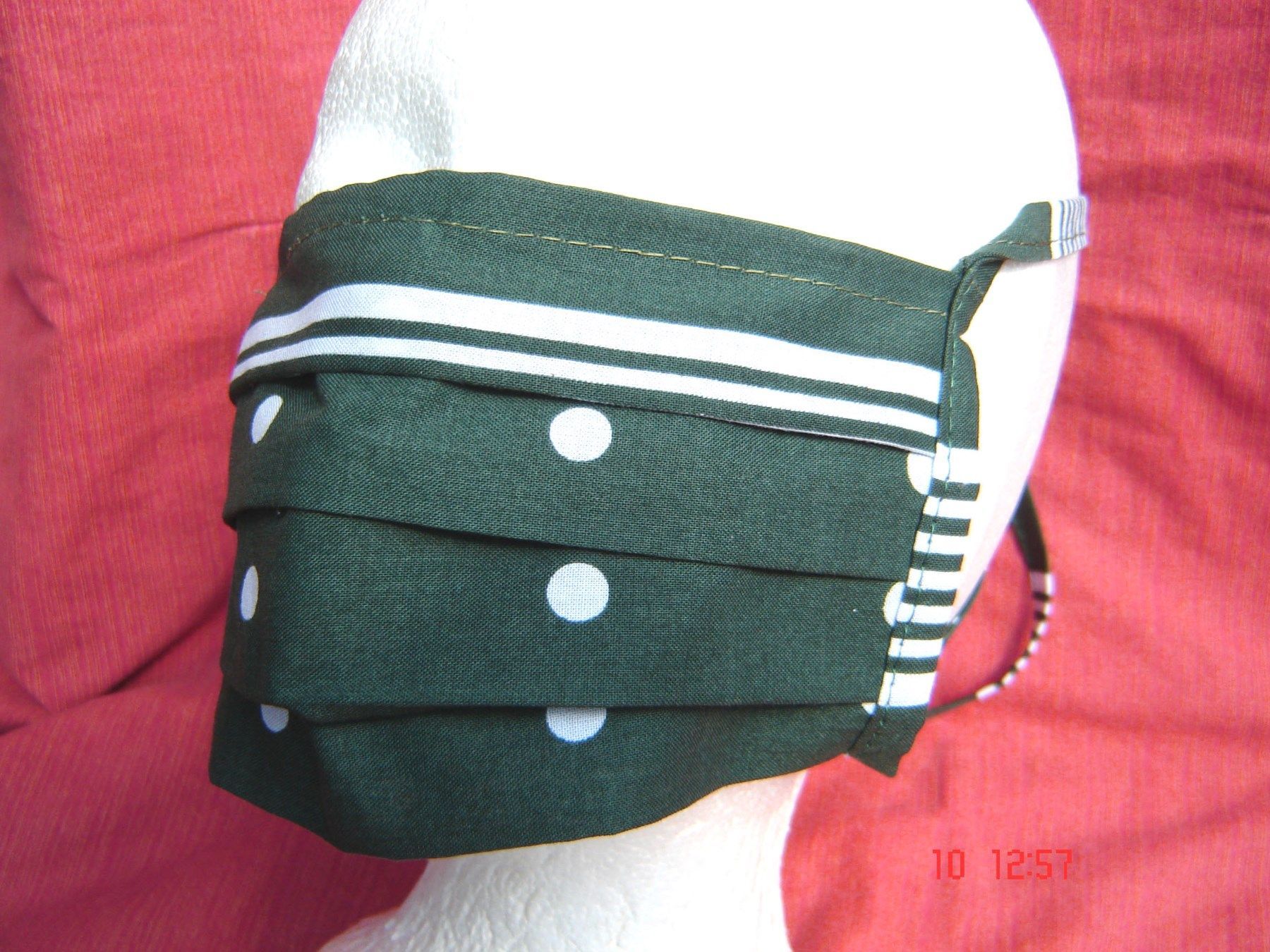 . Behelfsmaske passend zum Dirndl selbstgemachter Mund und Nasenschutz aus meiner Werkstatt doppellagig aus kochfestem Dirndlstoff , reine Baumwolle klassisch oliv grün mit Punkten habe die Stoffe vorher testweise in den Kochwaschgang in große Falten gelegt mit einem herausnehmbaren Draht der Saum h