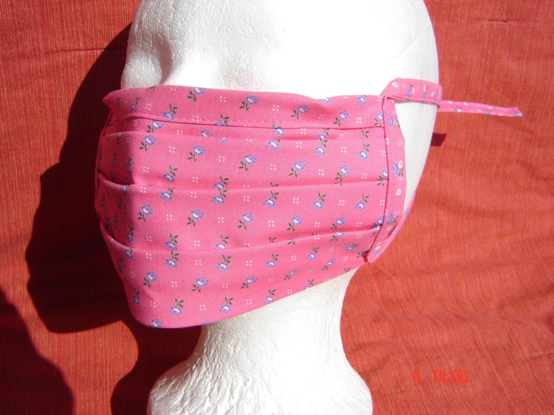 . Behelfsmaske passend zum Dirndl selbstgemachter Mund und Nasenschutz aus meiner Werkstatt doppellagig aus kochfestem Dirndlstoff , reine Baumwolle in Farbe rosa mit Blümchen habe die Stoffe vorher testweise in den Kochwaschgang in große Falten gelegt mit einem herausnehmbaren Draht der Saum hat ei
