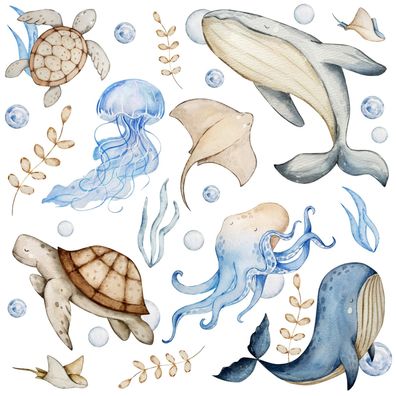 • Muralo Wandtattoo Wandsticker für Kinderzimmer Meerestiere Aquarell Aufkleber