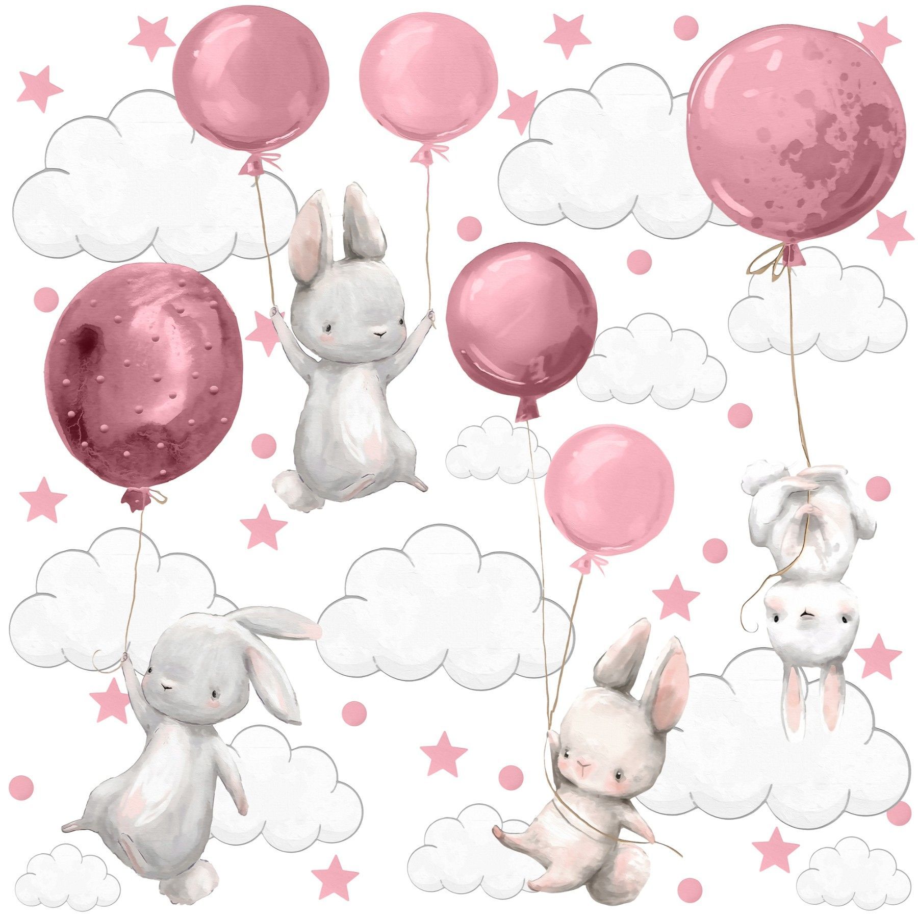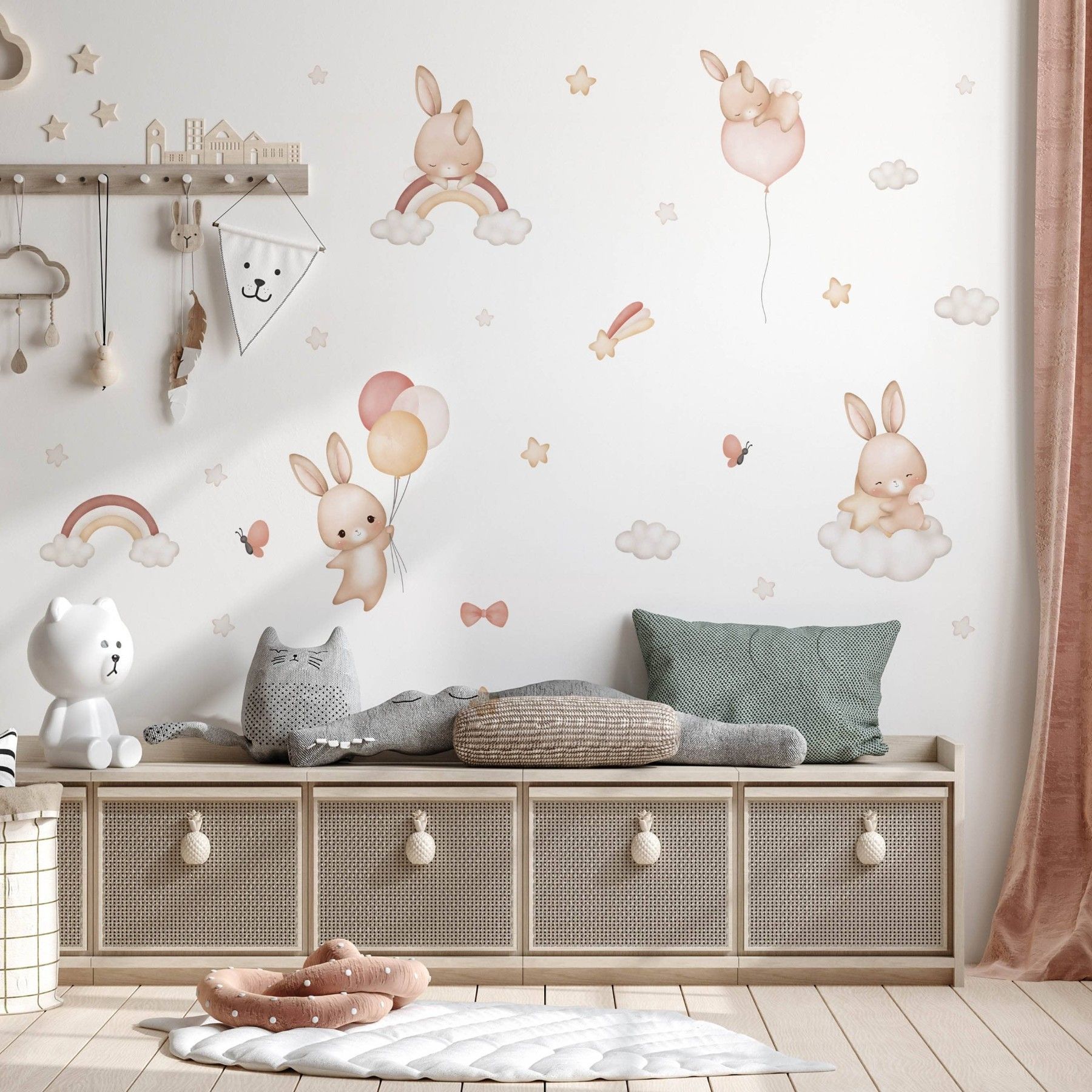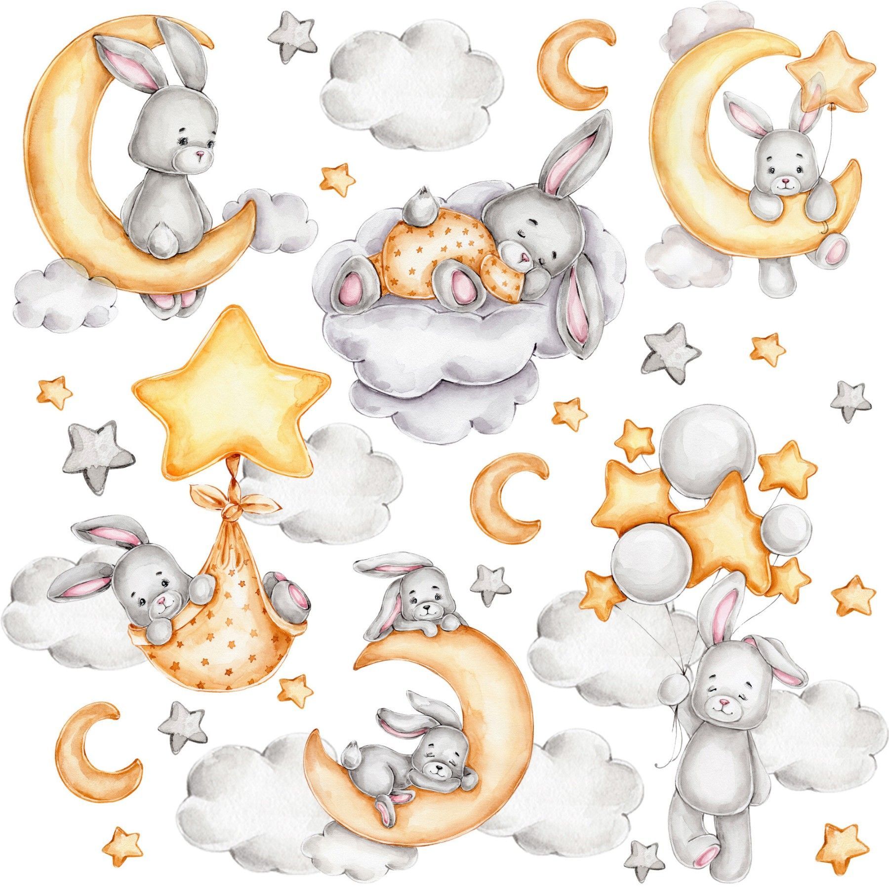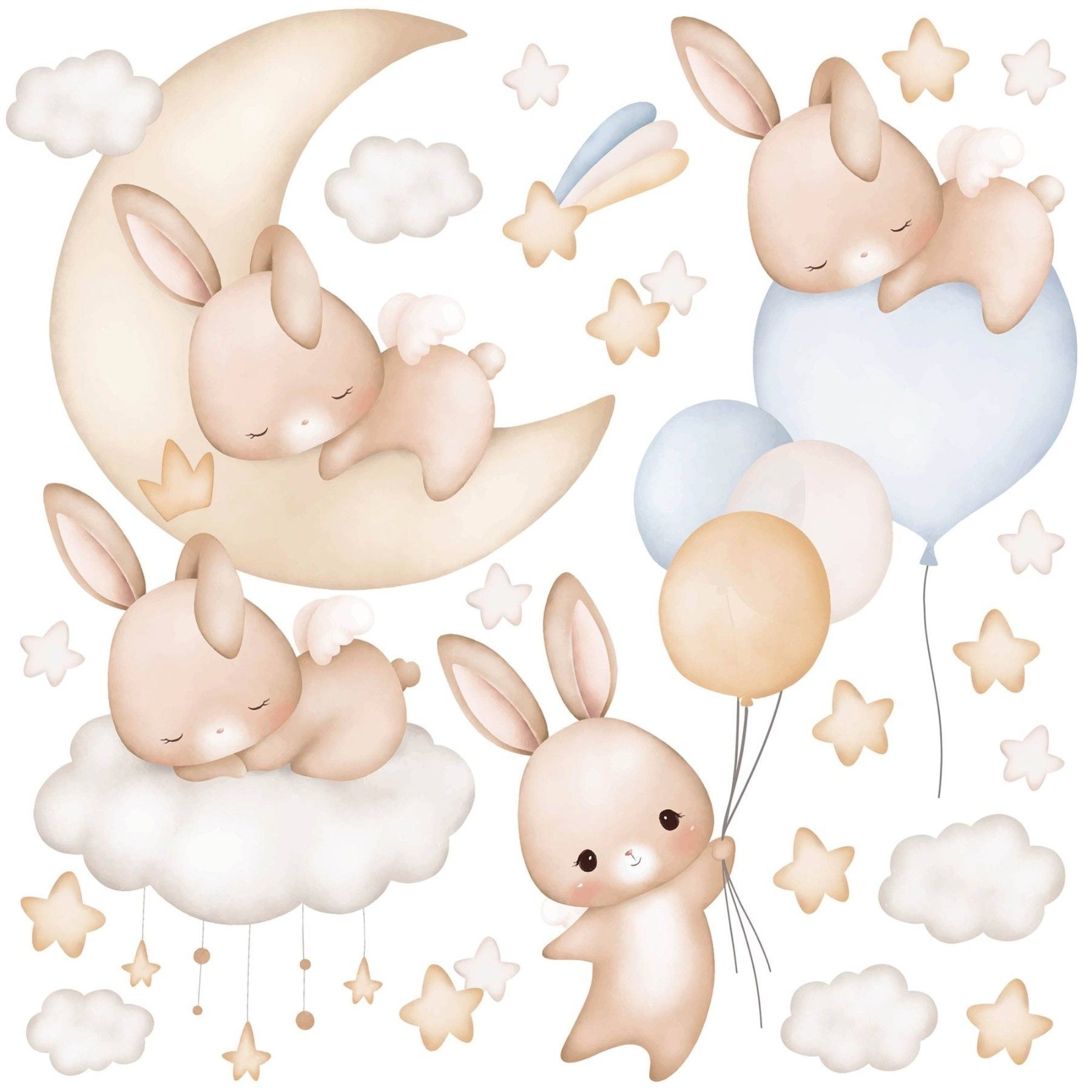 Muralo Aufkleber Set für Kinderzimmer Kaninchen Wolken Sterne Wandstickers für Kinder