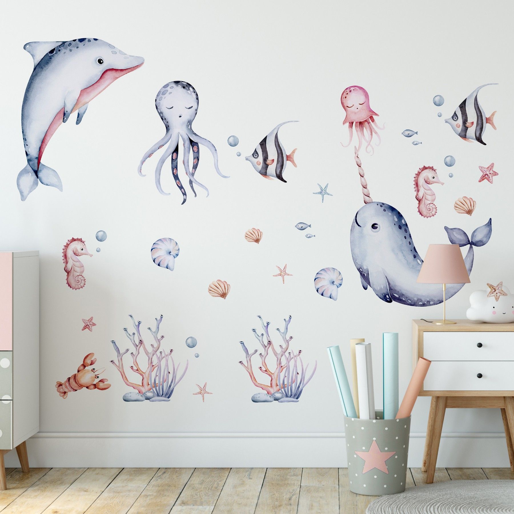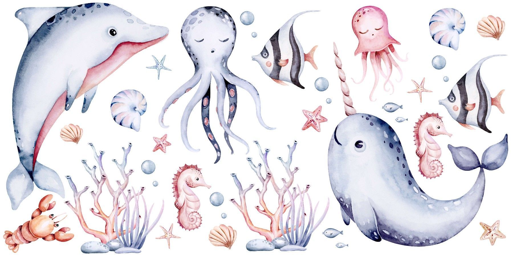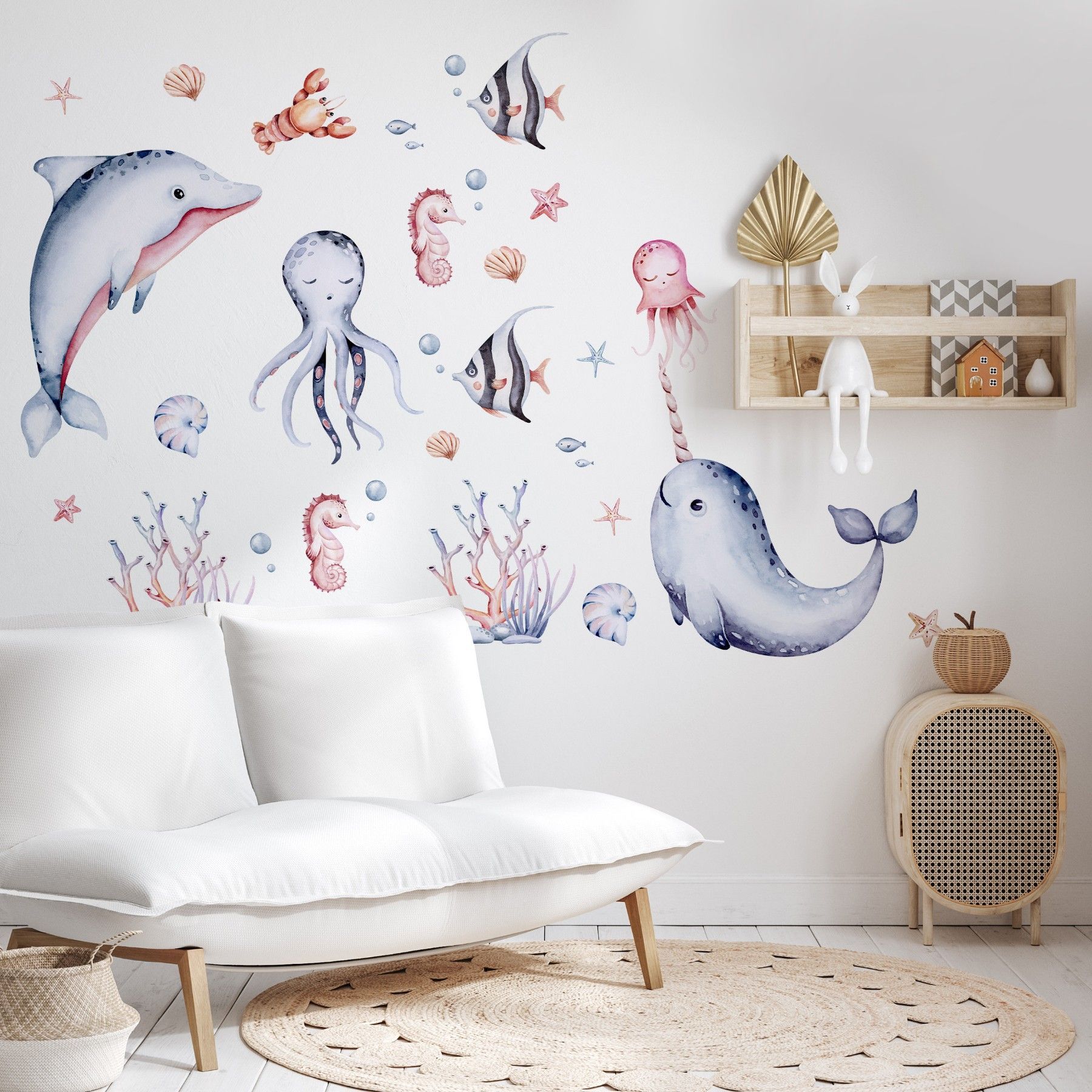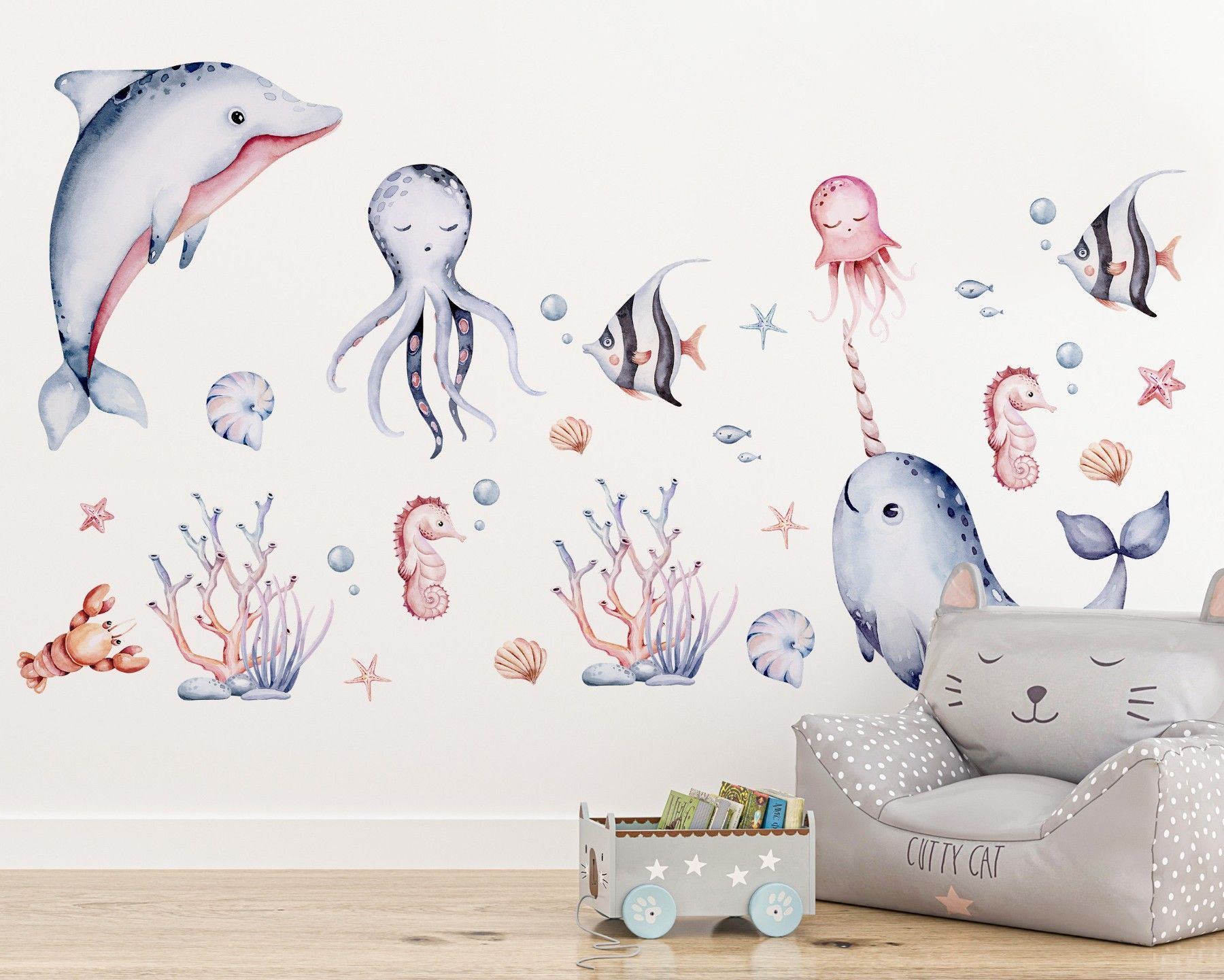 Muralo Wandtattoo Wandsticker für Kinder bunte Meerestiere Aquarell Aufkleber