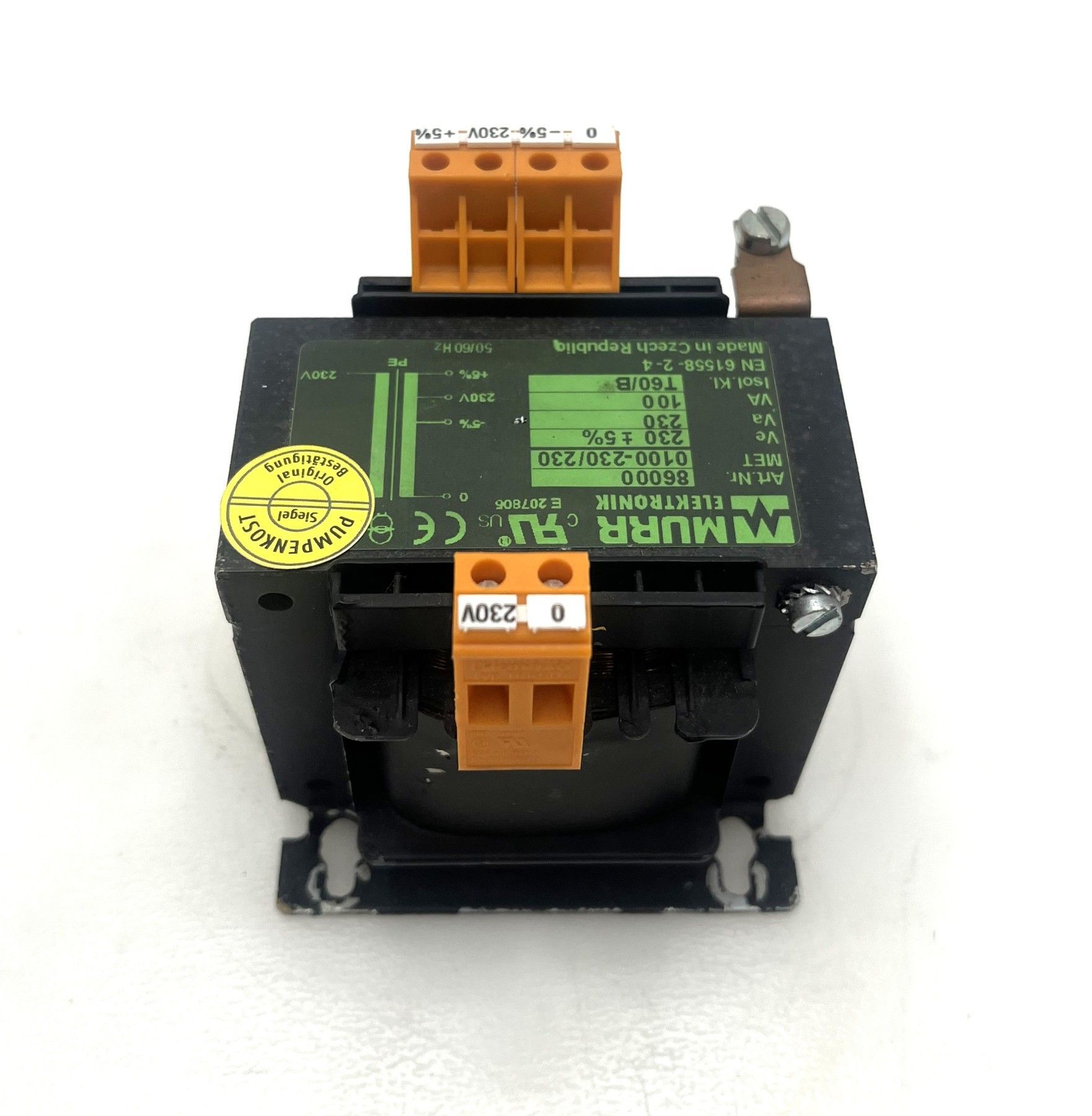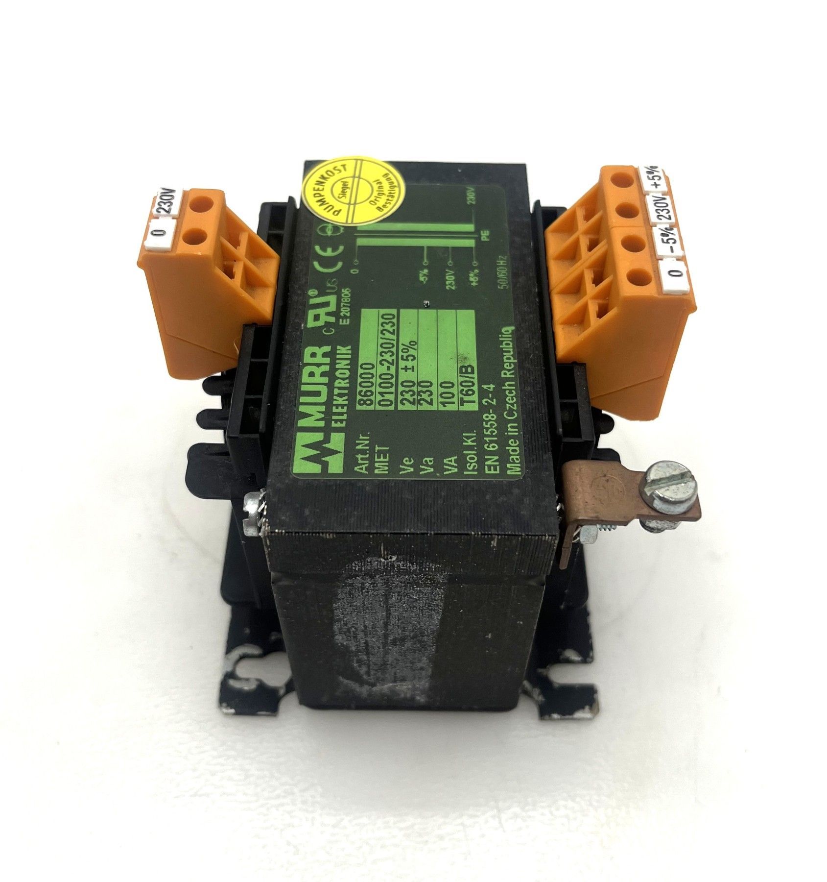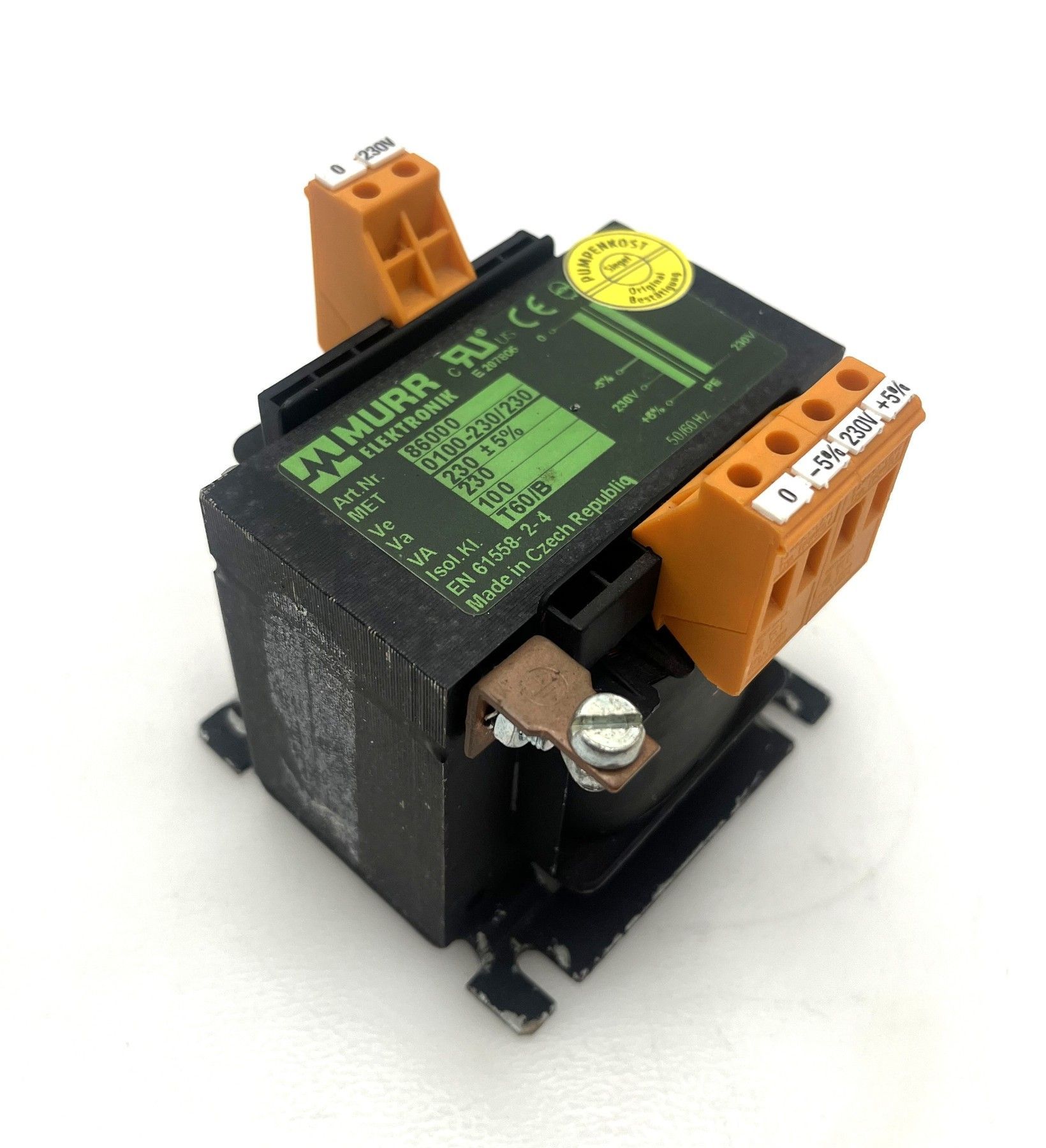 Transformator von Murrelektronik – 230V 230V, 100 VA Dieser hochwertige Transformator von Murrelektronik eignet sich ideal als Sicherheitstrenntrafo zur galvanischen Trennung von Stromkreisen in Industrie- und Steuerungsanwendungen. Technische Daten Hersteller: Murrelektronik (Murr Elektronik)