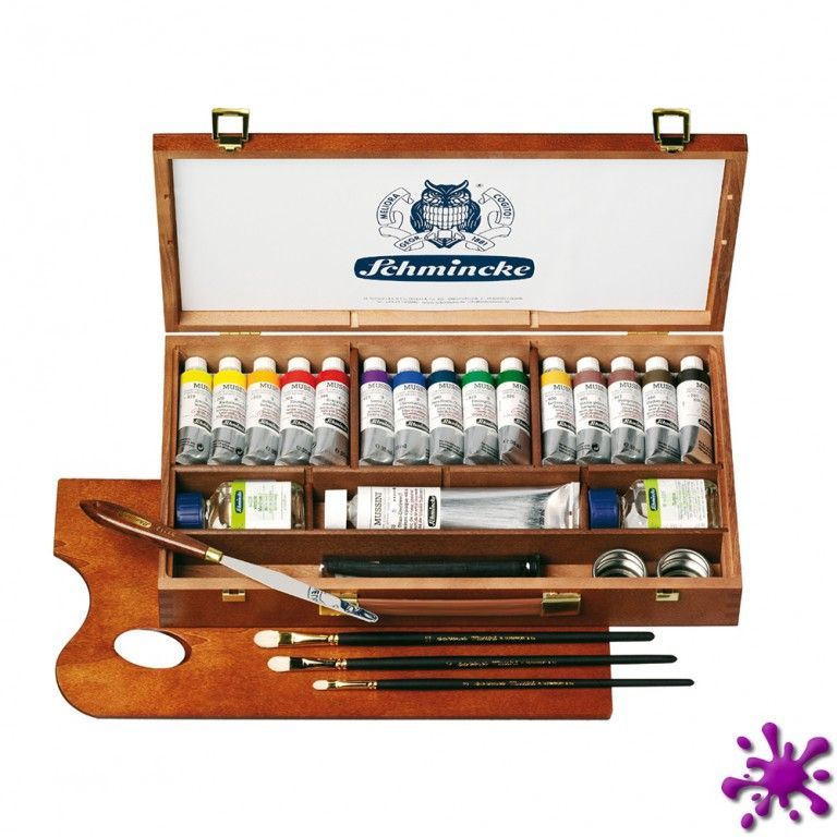 Mussini Ölfarbe Schmincke großer Holzkasten, 15 x 35ml + 120ml weiß und viel Zubehör