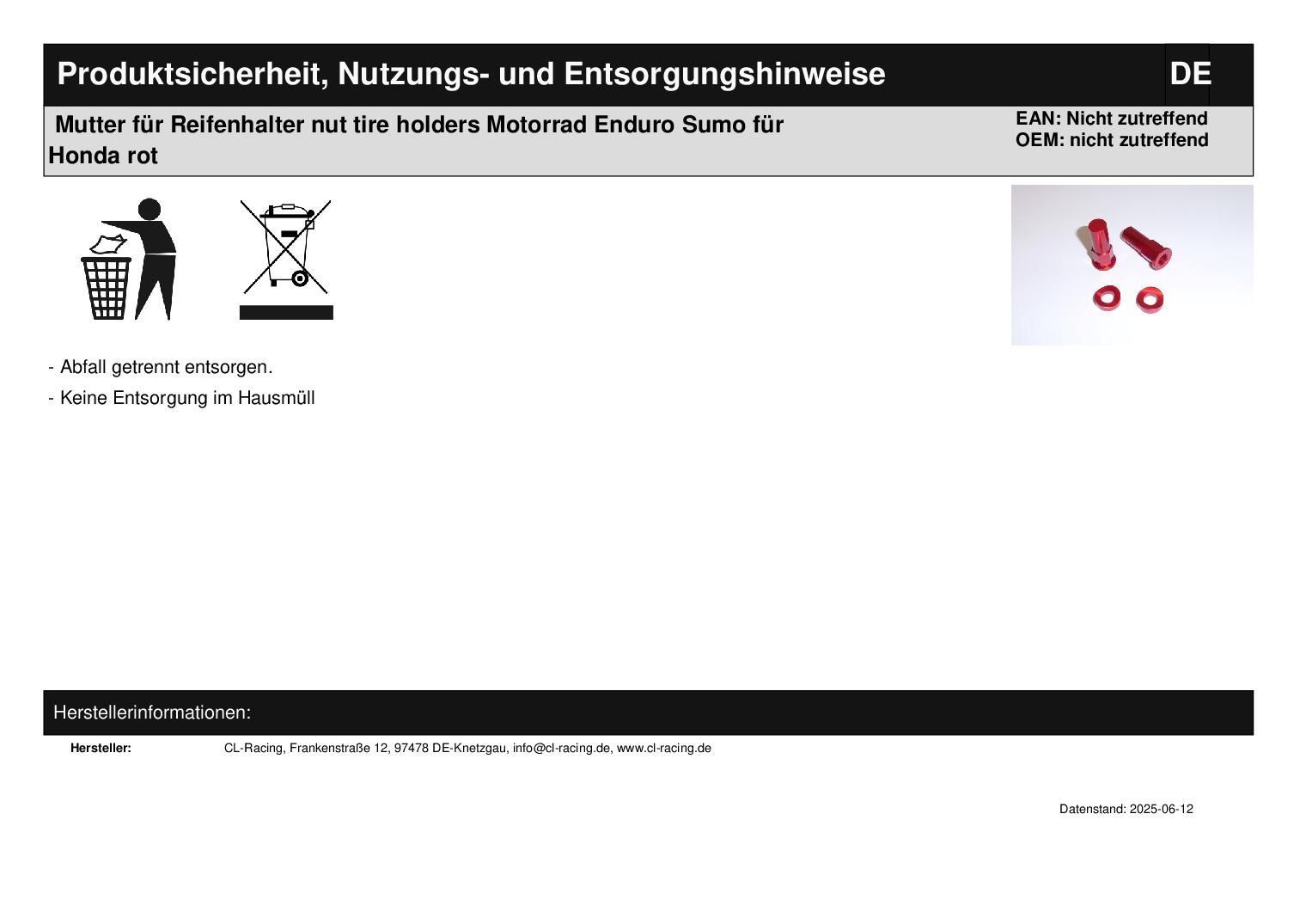 Mutter für Reifenhalter nut tire holders Motorrad Enduro Sumo passt an Honda rot In dieser Auktion gibt es folgenden Artikel zu kaufen: Mutter mit Distanzring für Reifenhalter (siehe Foto) passend für: Enduros und Crosser mit Reifenhalter, der ein Gewinde M8 hat Gewinde: M8 Lieferumfang: 1 Paar Arti