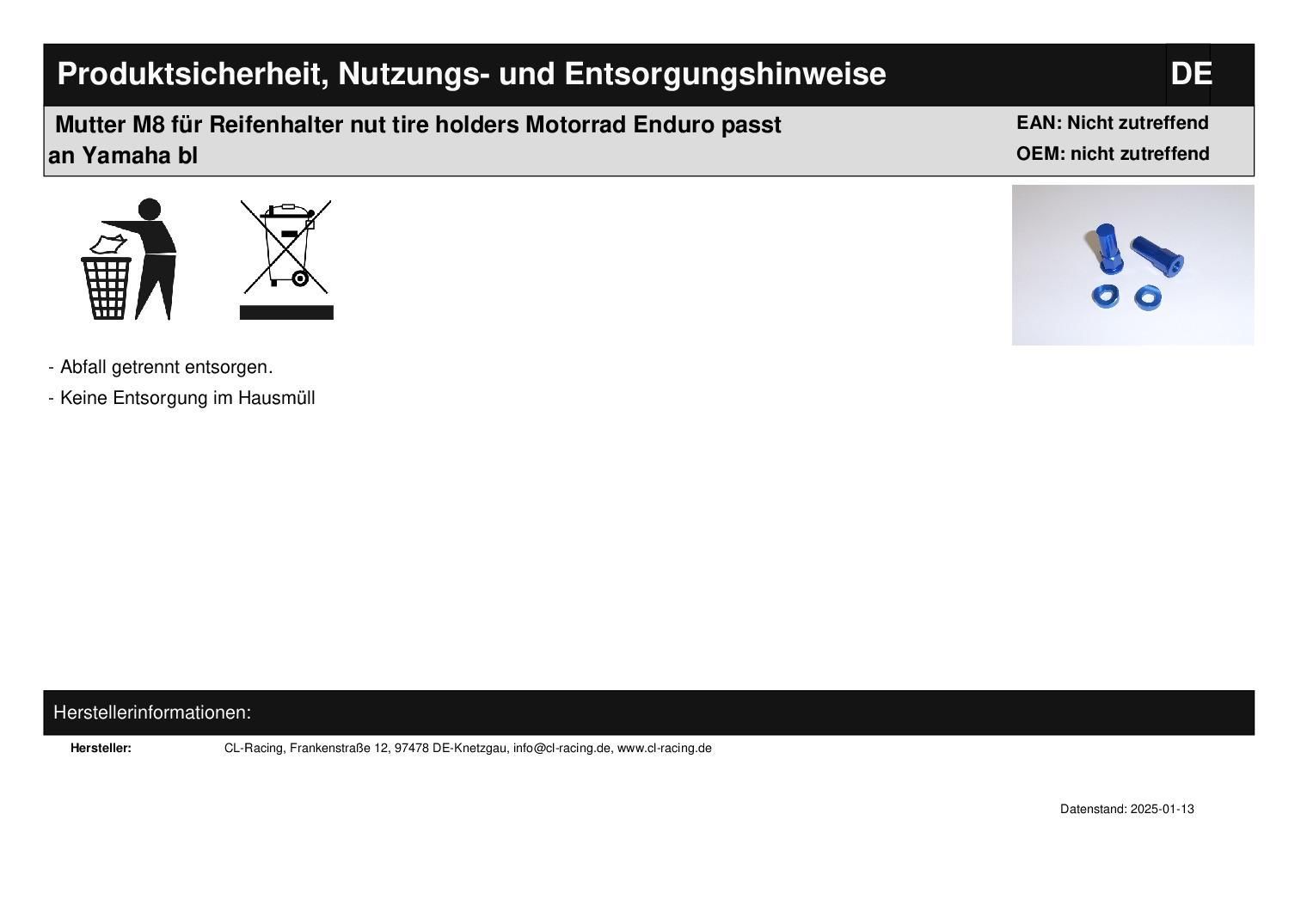 Mutter M8 für Reifenhalter nut tire holders Motorrad Enduro passt an Yamaha bl