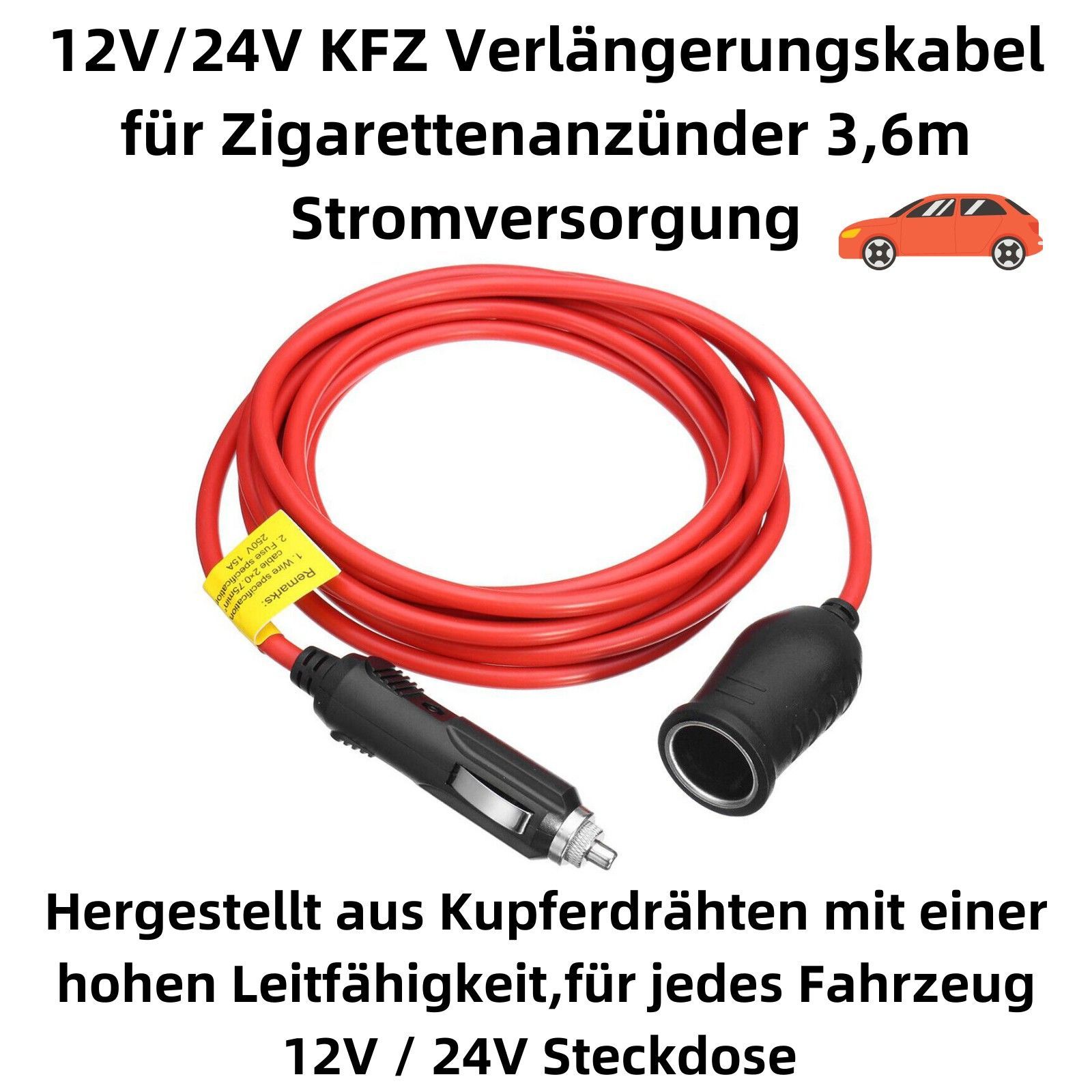 N36C 12V/24V KFZ Verlängerungskabel Zigarettenanzünder mit Stecker Buchse 3,6m