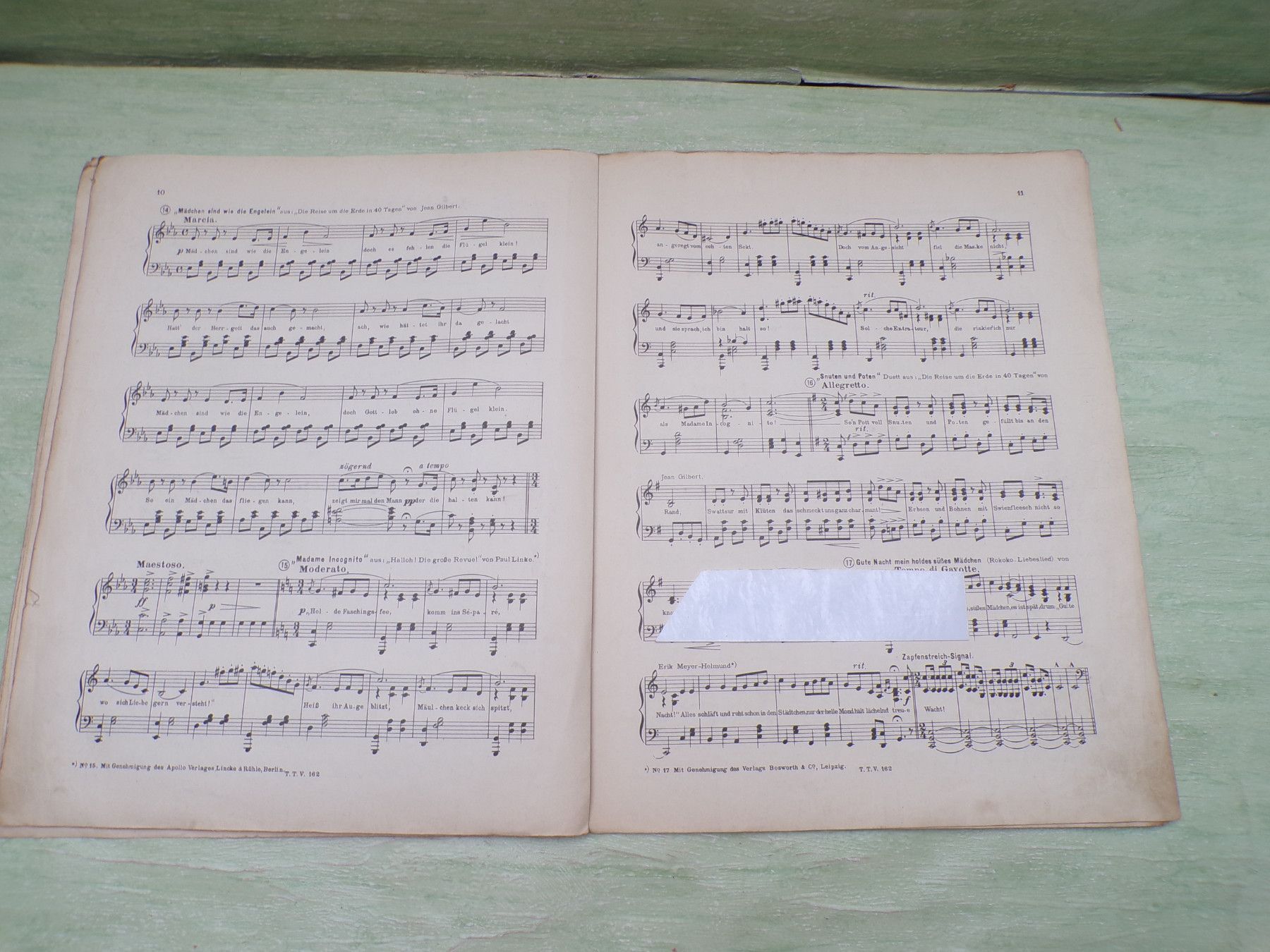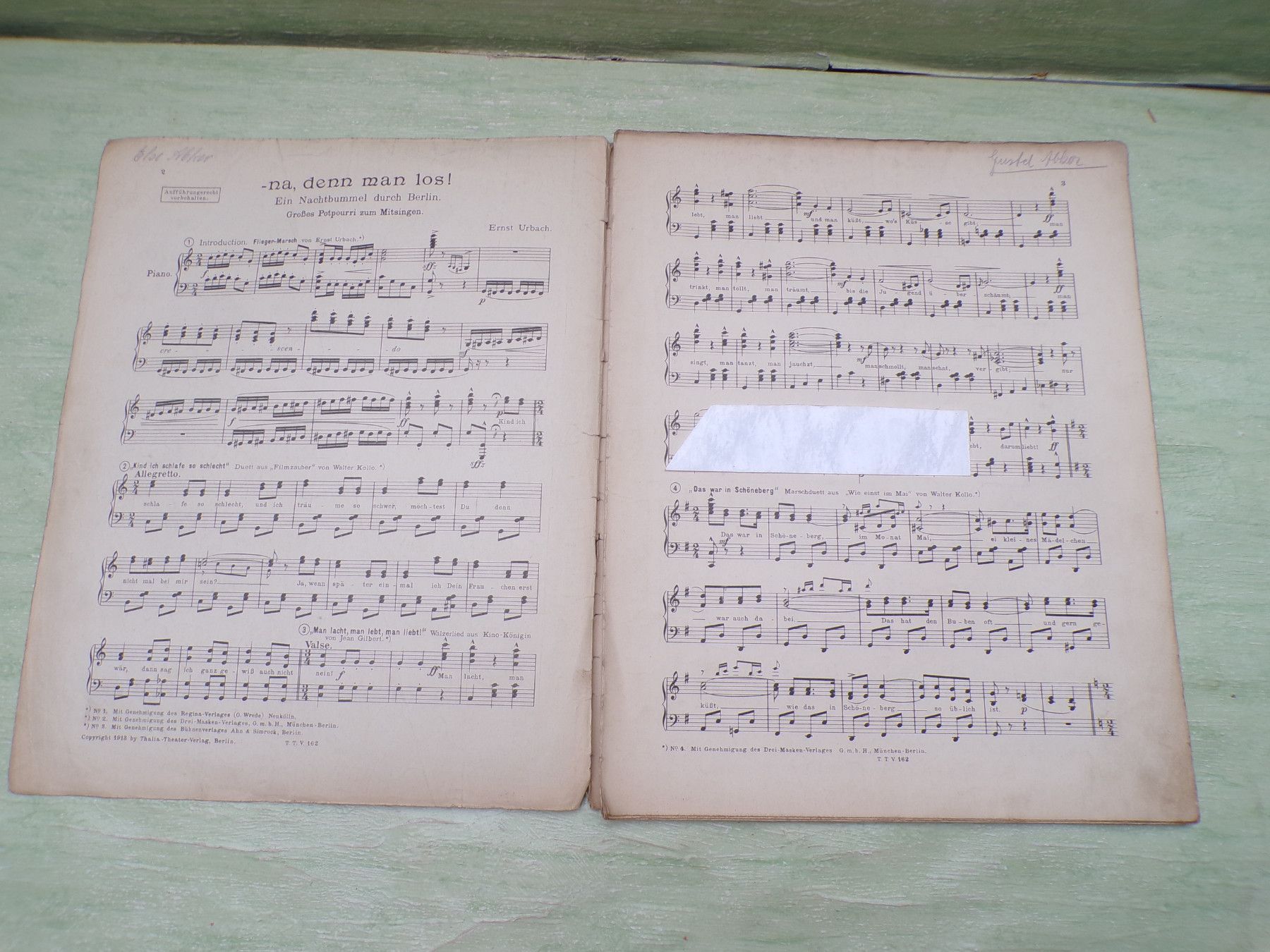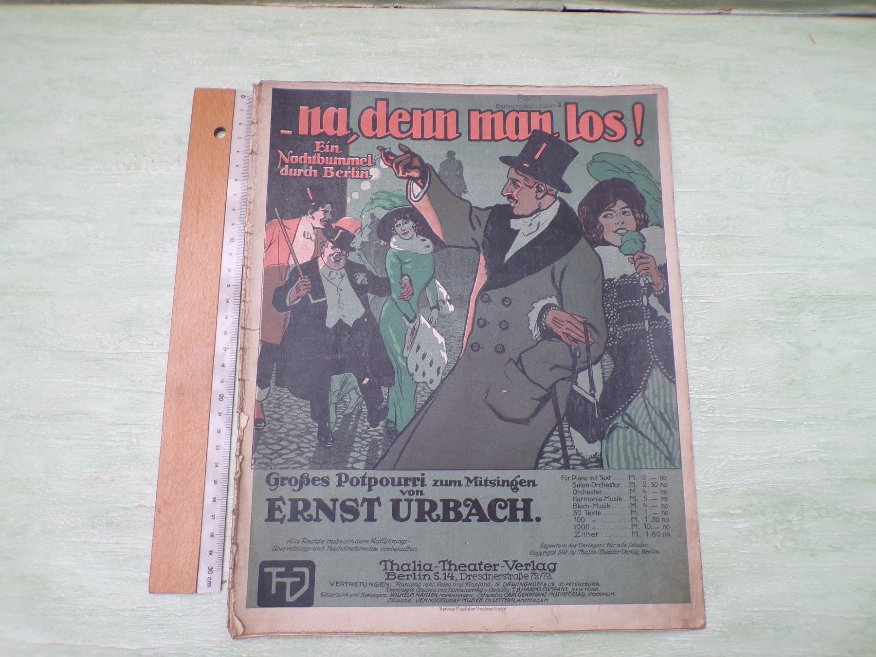 ... Erinnerungen ..... ...na, denn man los ! . Ein Nachtbummel durch Berlin . Großes Potpourri zum Mitsingen von Ernst Urbach . Copyright 1913 by Thalia Verlag , Berlin TTV162 . ca 34 x 27 cm 16 Seiten Notenheft mit Text . Zustand : Heftrücken beschädigt, Seiten altersentsprechend gut(+) . . desweit