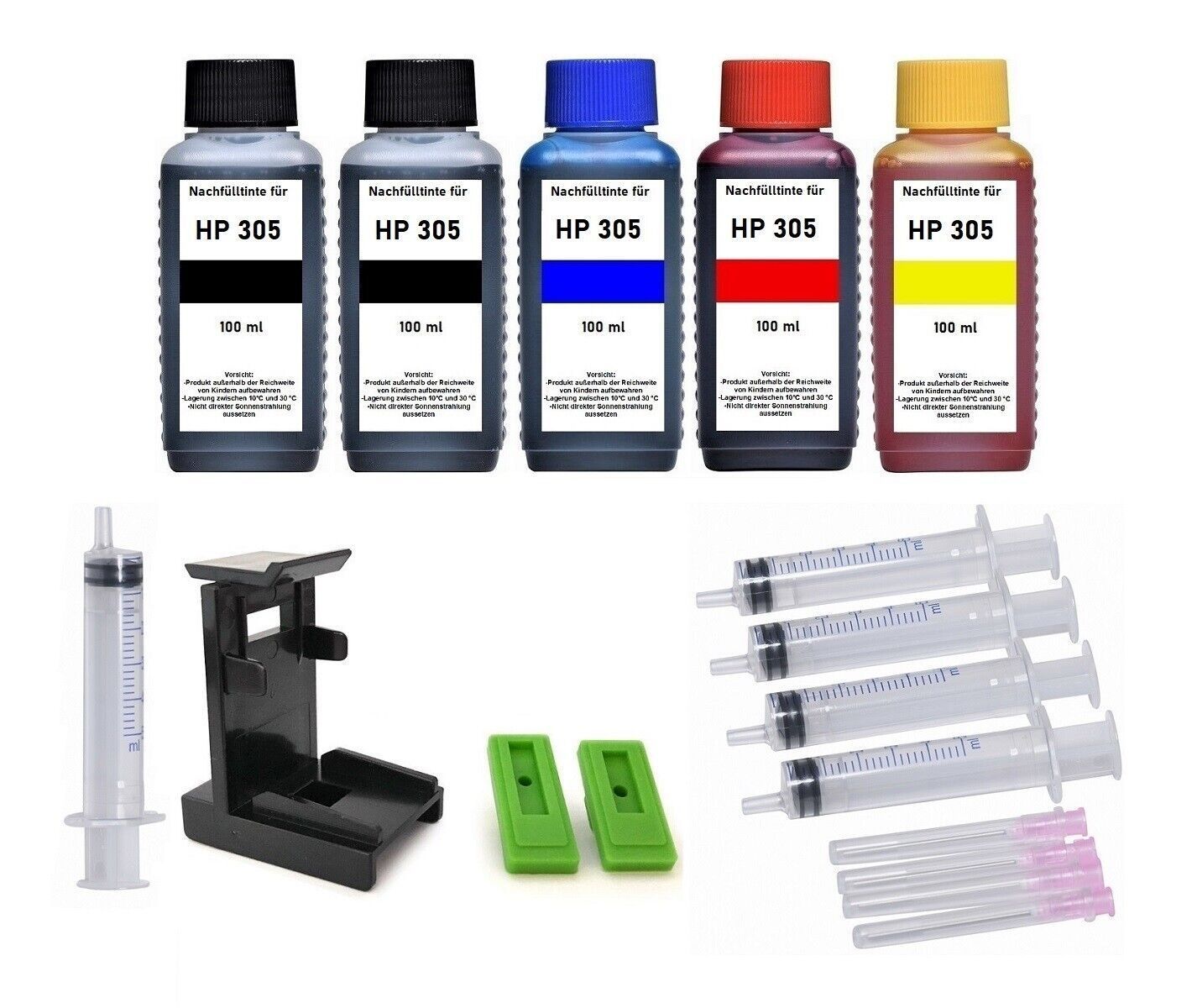 Nachfülltinte für die Druckerpatronen HP 305 HP 305 XL black und color, HP 307 XL black 3 YM61AE, 3YM62AE, 3YM64AE black und 3YM60AE, 3YM63AE color Für die Tintenpatronen der Drucker HP Deskjet 2320, 2710, 2710e, 2720, 2720e, 2721, 2721e, 2722, 2722e, 2723, 2723e, 2724, 2732, 2752, 2755, 2755e HP De... Mehr