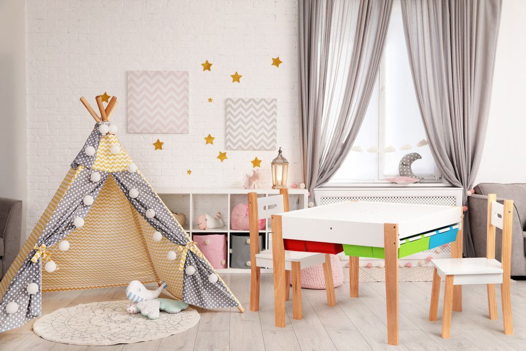 Nachhaltiger Kindertisch aus Holz mit 2 Stühlen & sicherer Spielbereich