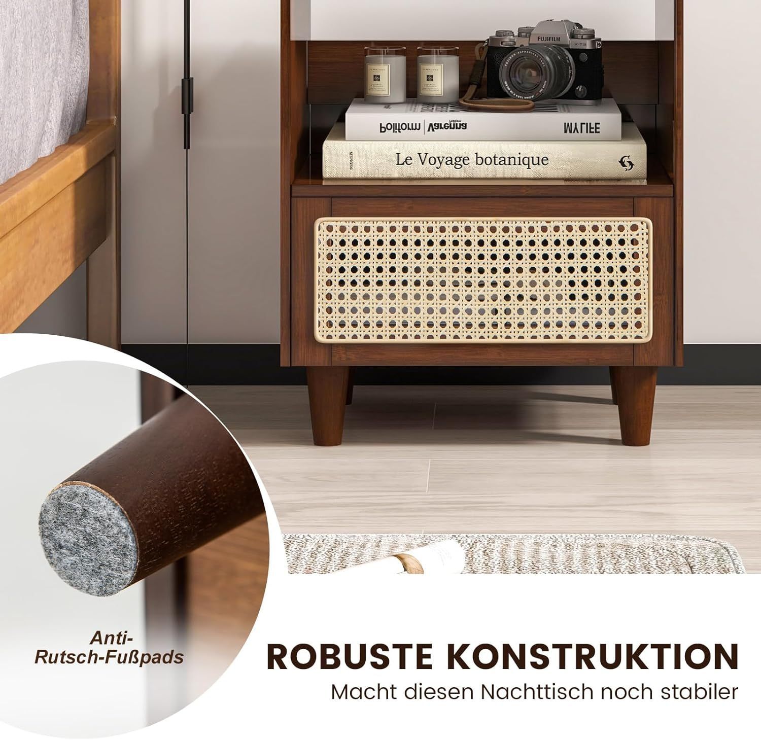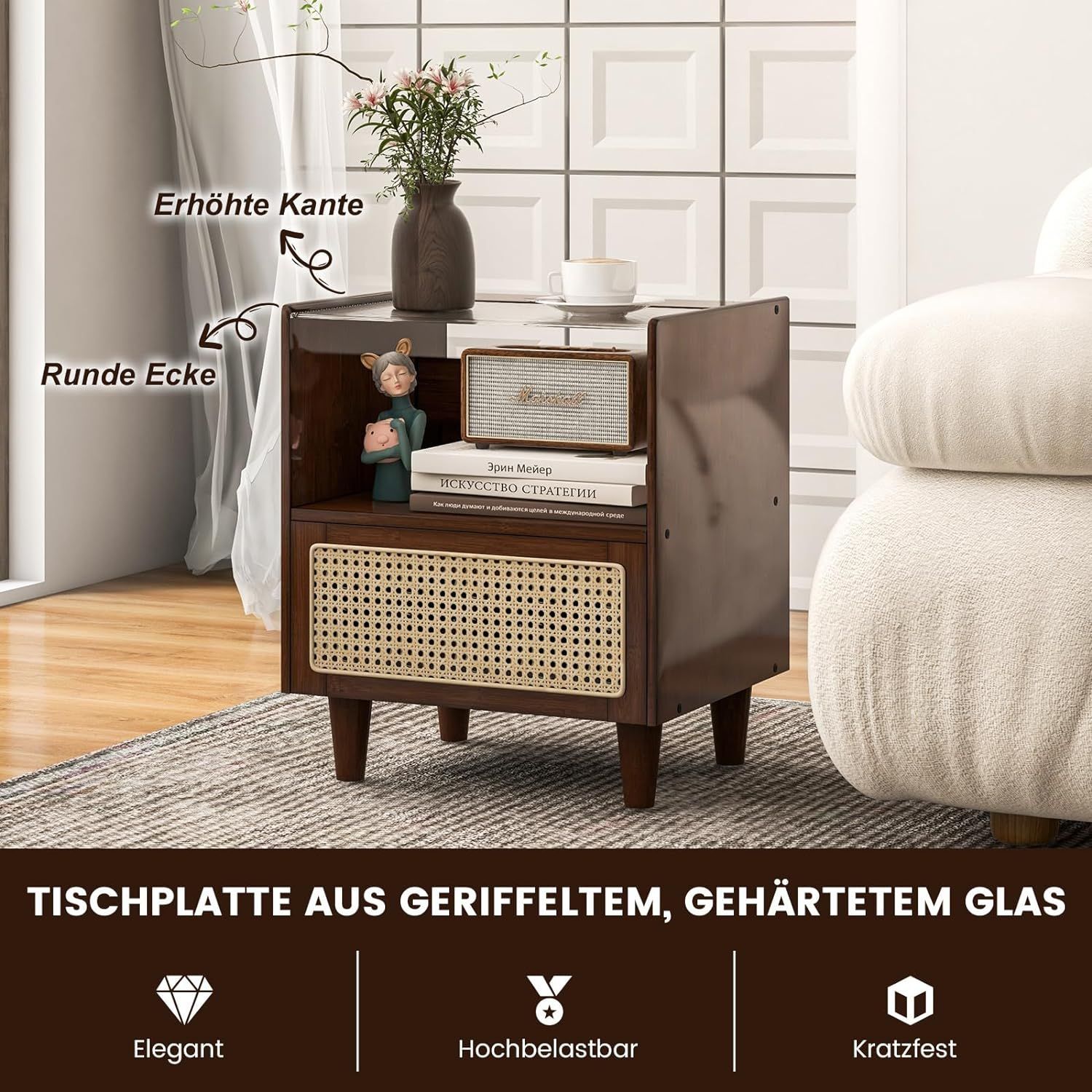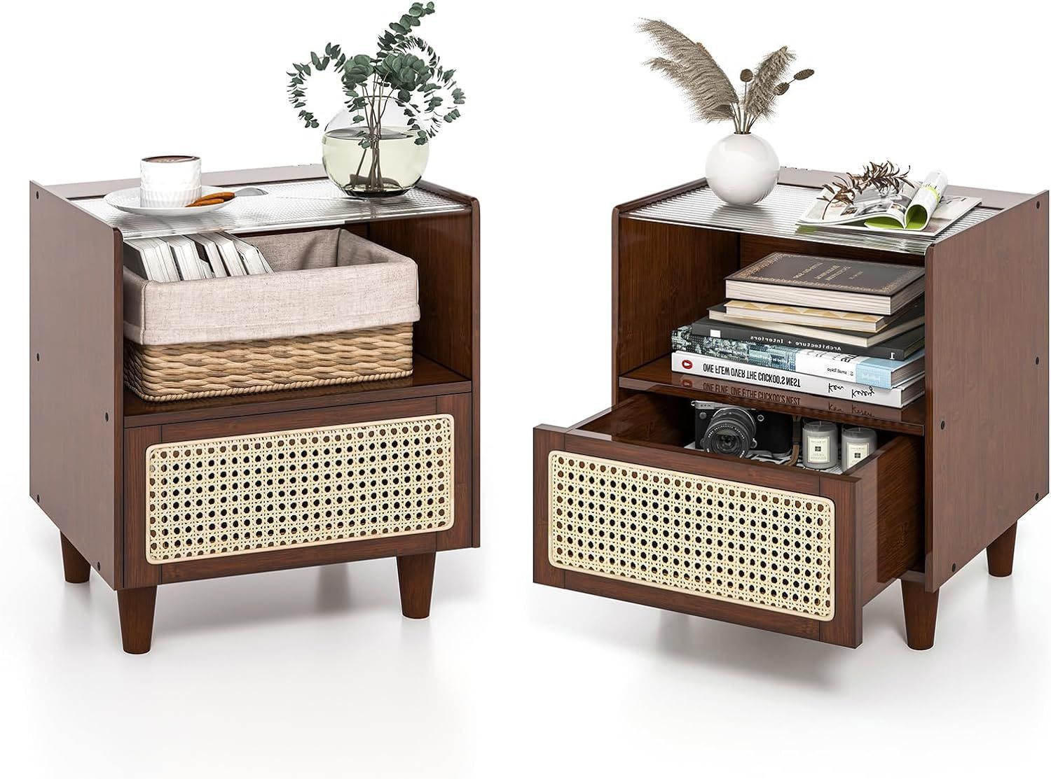 Nachttisch aus Bambus & Rattan mit Schublade, Beistelltisch mit Glastischplatte
