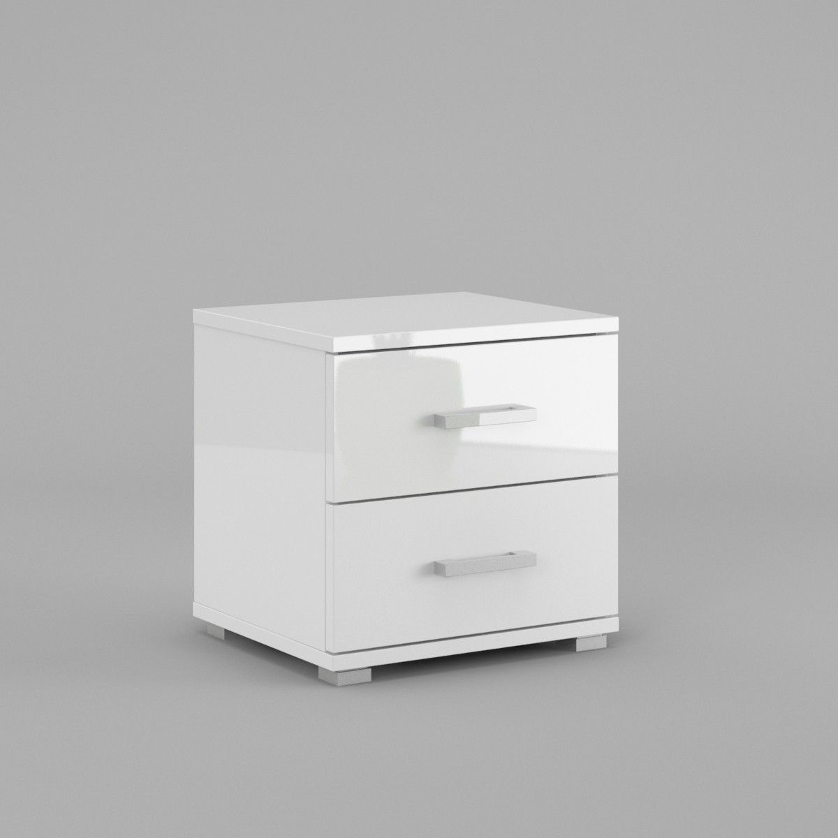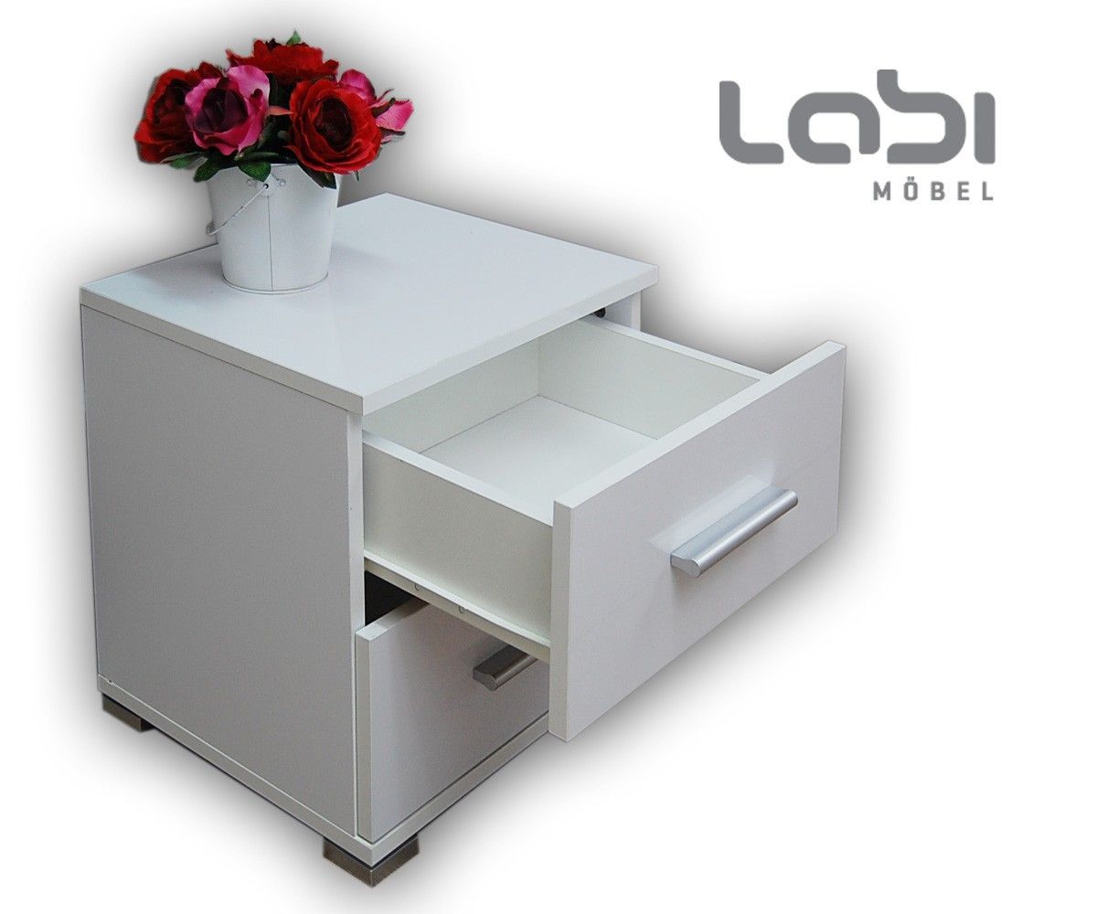 Nachttisch mit zwei Schubladen, ganz weiß glänzend Höhe 40 cm Breite 40 cm Tiefe 35 cm Seiten, Fronten und Oberseite weiß Hochglanz Möbelgriffe wie auf Bild 4 Der Schrank ist über Exzenter verschraubt und weist keine von außen hervorstehenden Schrauben oder Stifte auf Hergestellt aus UV-lackierter M
