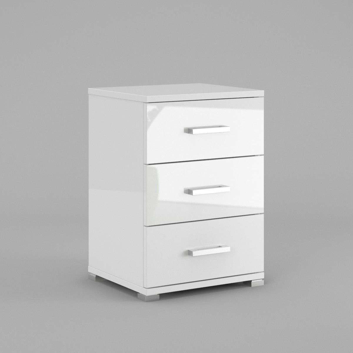 Nachttisch mit drei Schubladen, ganz weiß glänzend Höhe 40 cm Breite 40 cm Tiefe 35 cm Seiten, Fronten und Oberseite weiß Hochglanz Möbelgriffe wie auf Bild 3 Der Schrank ist über Exzenter verschraubt und weist keine von außen hervorstehenden Schrauben oder Stifte auf Hergestellt aus UV-lackierter M