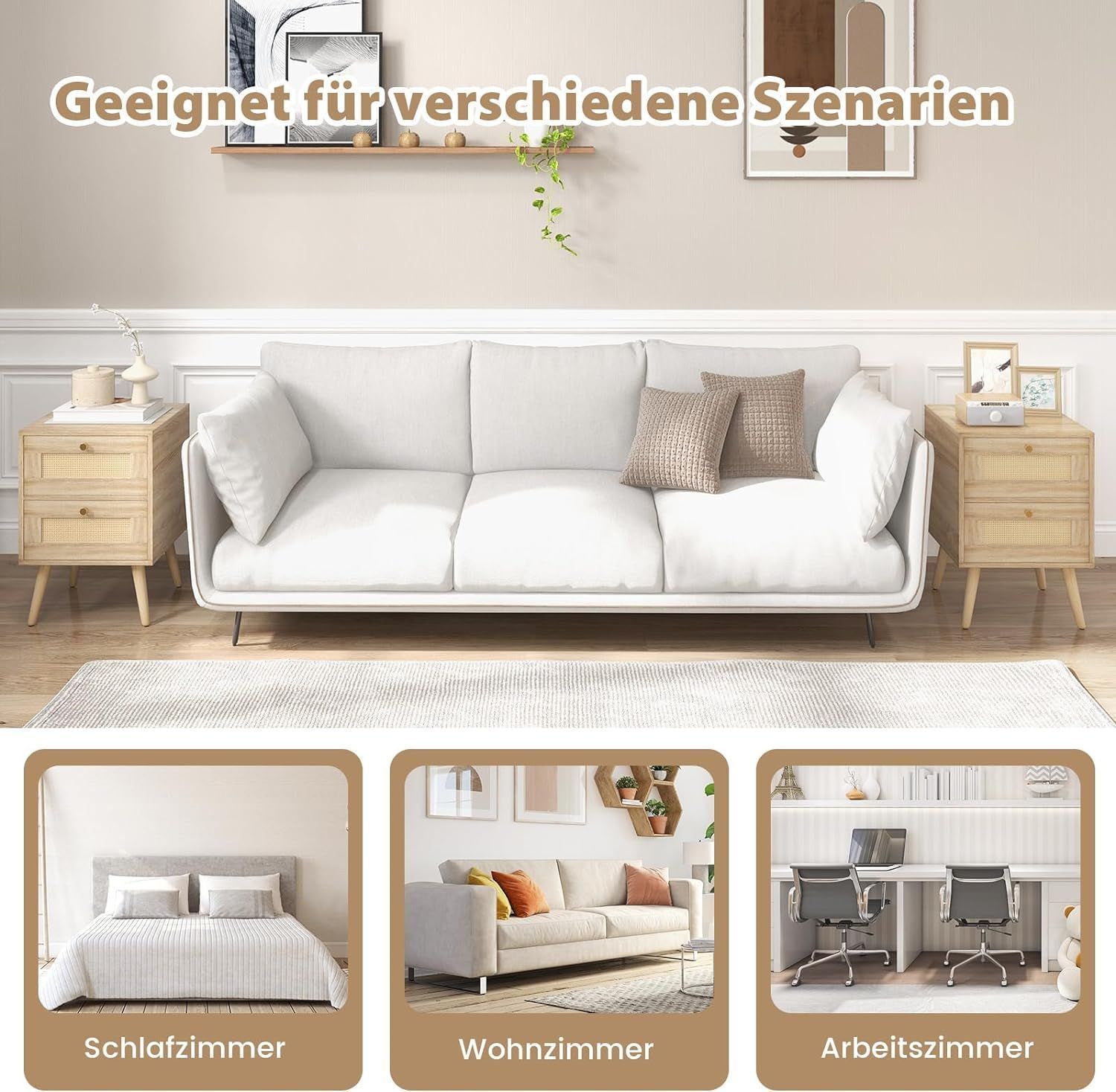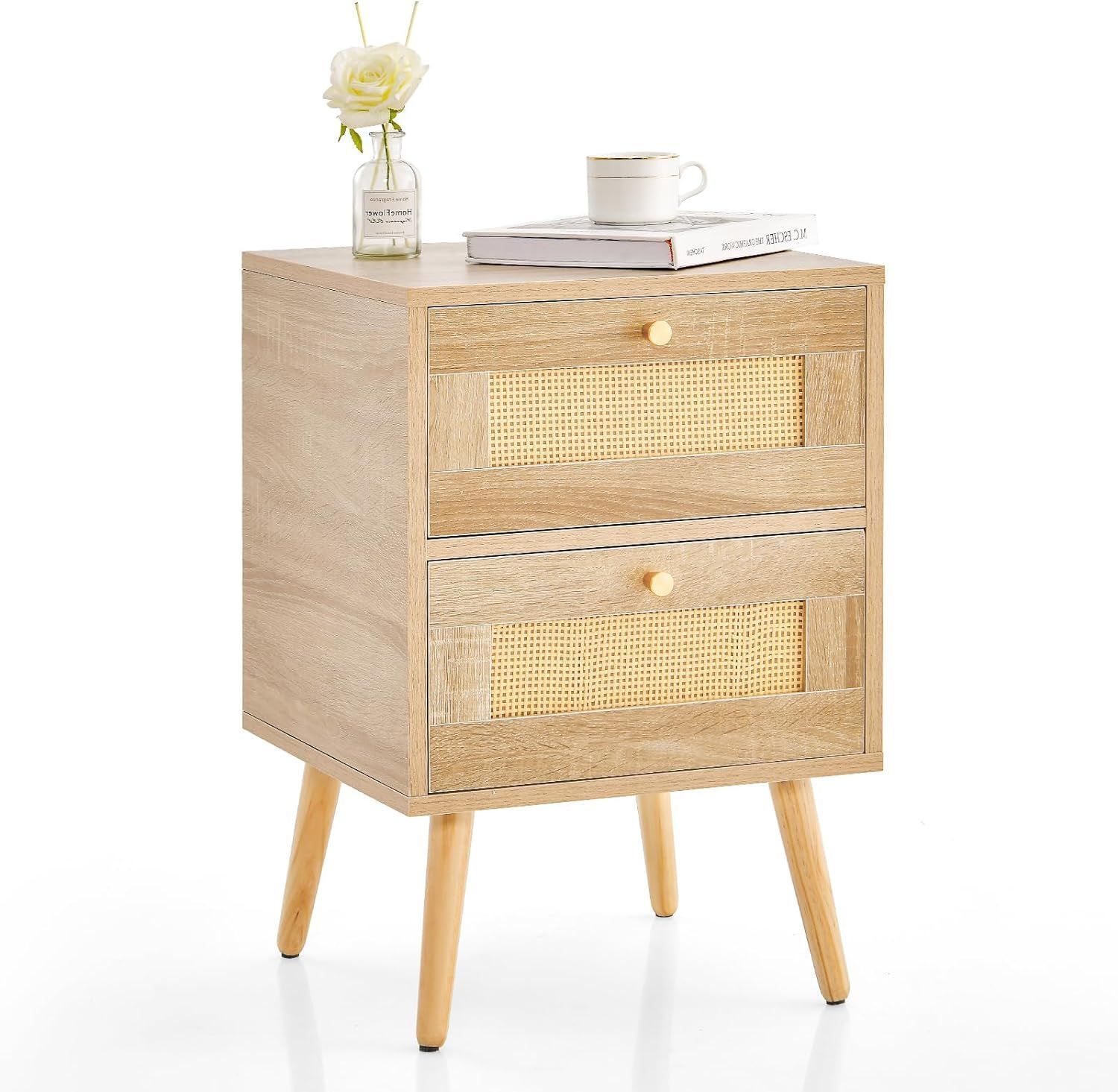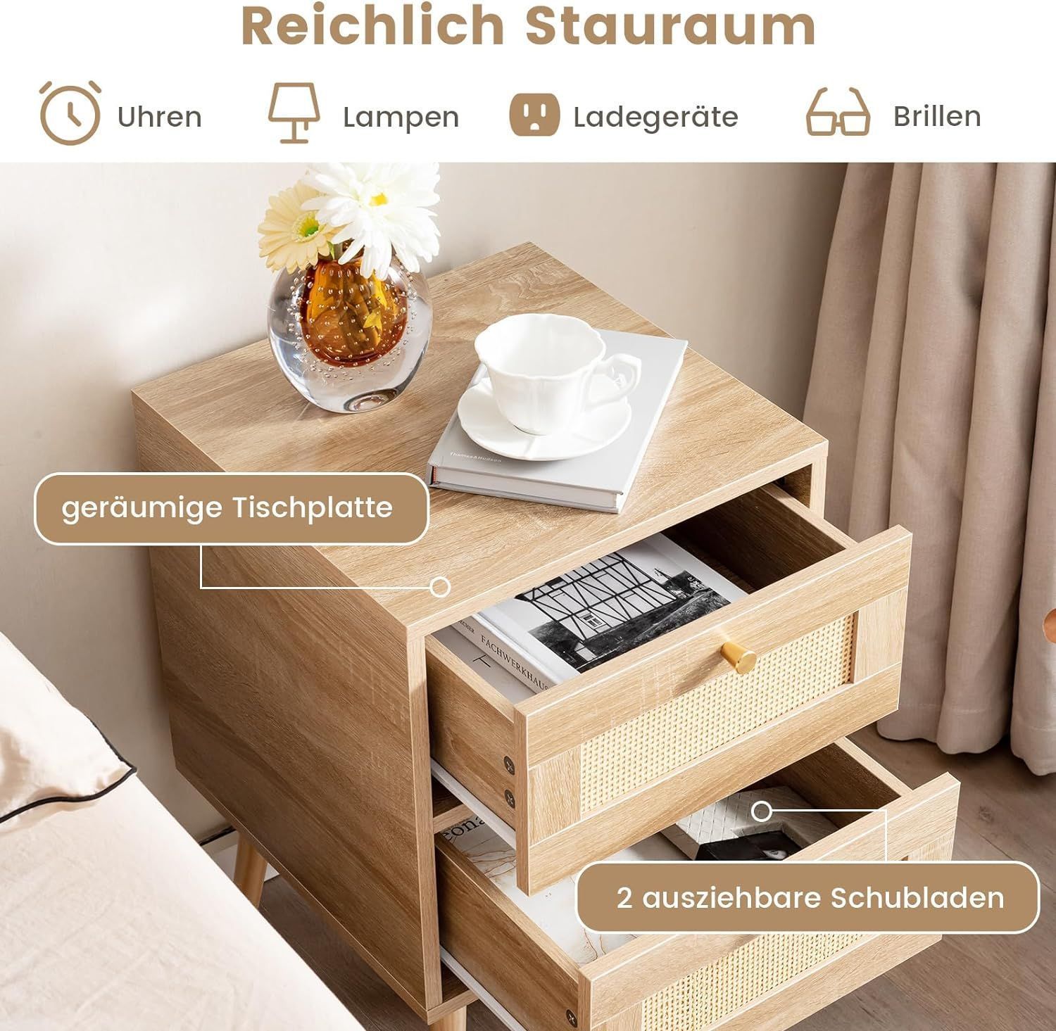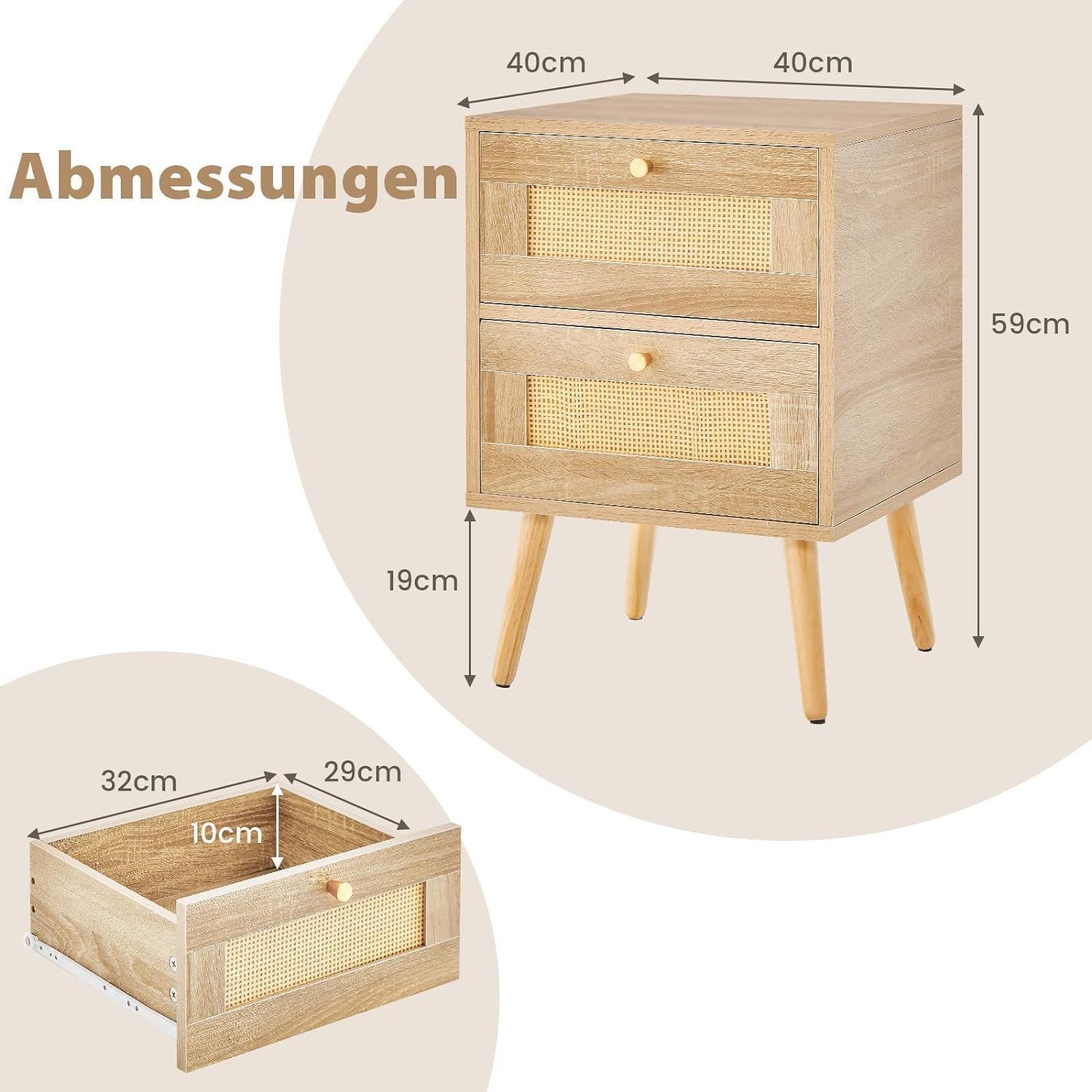 Nachttisch Rattan, Nachtschrank mit 2 Schubladen und Massivholzbeinen, Beistelltisch