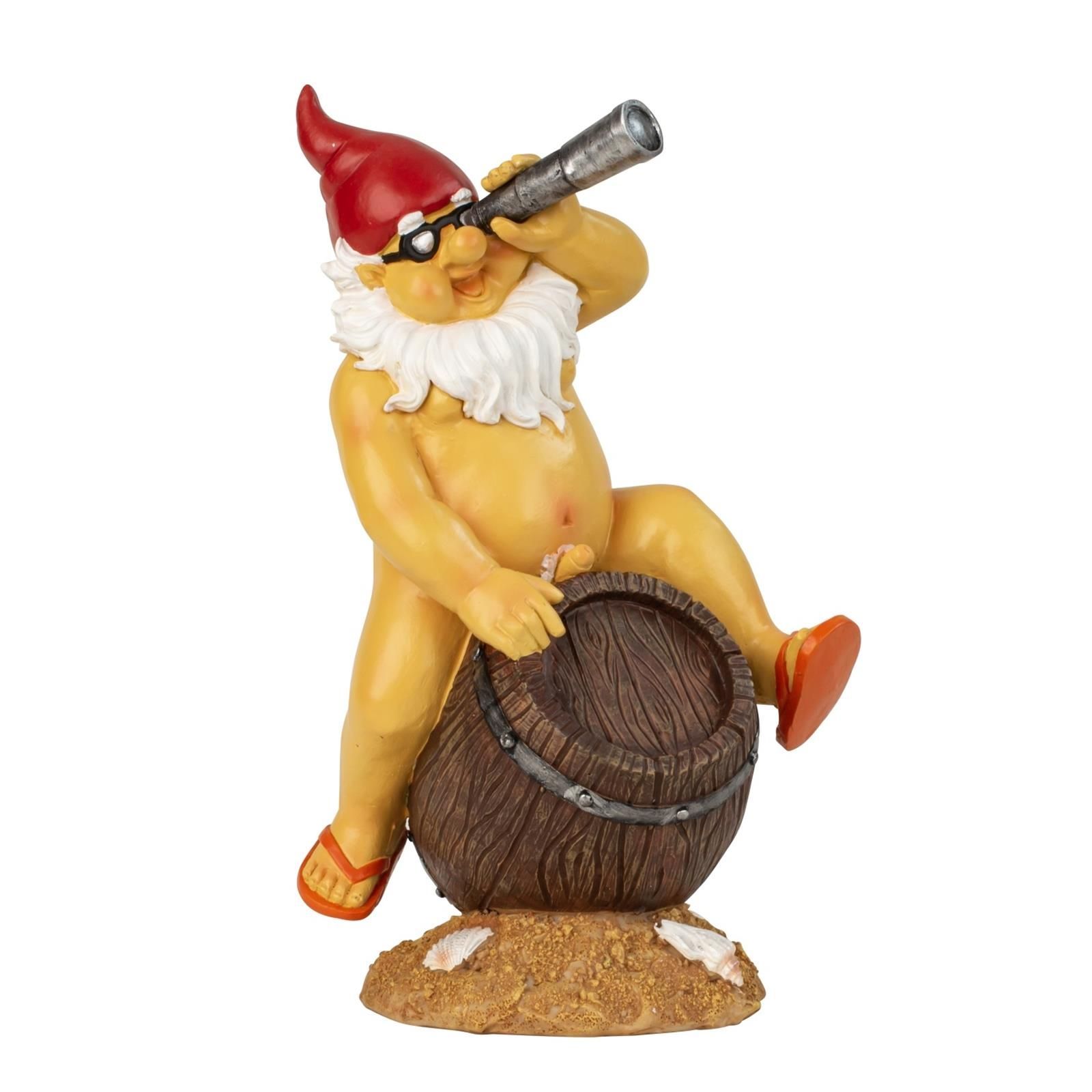 Nackter Zwerg mit Fernrohr auf Fass Gartenzwerg H 31 cm