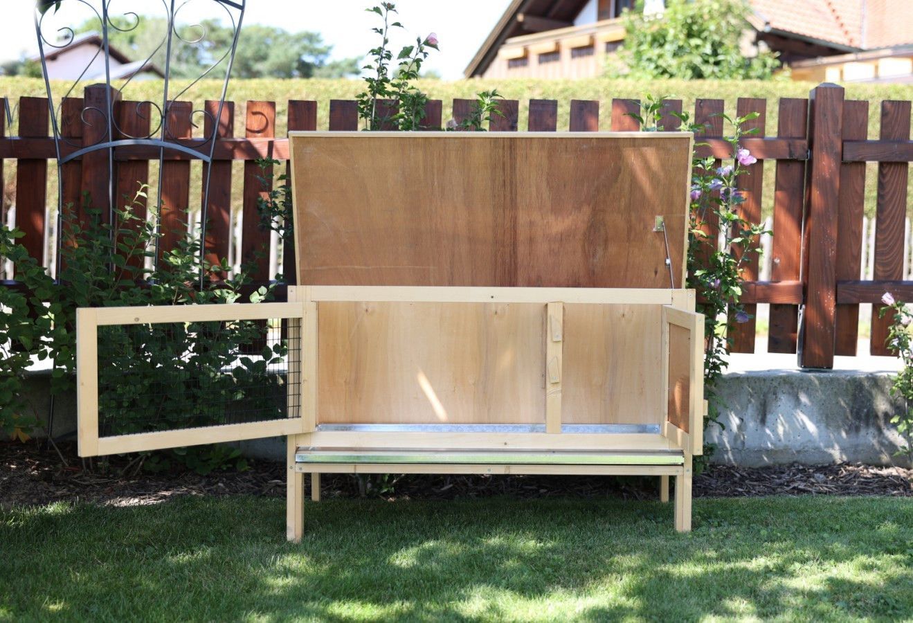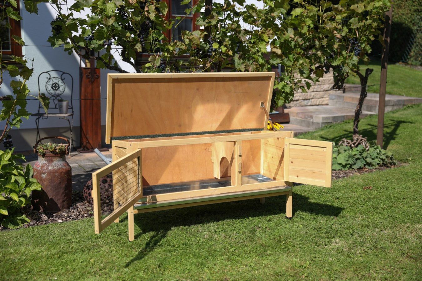 Nagerhaus Alfred 116 x 45 x 62 cm x 40 cm Innenhöhe 2 Türen getrennt zu öffnen verzinkte Wanne erleichtert die Reinigung Front mit hochwertigem Gitter Durchschlupf zum Ruheraum aufklappbares Bitumendach mit Dachfixierung inkl. Aufbauanleitung, einfache Montage Lieferung erfolgt zerlegt im Karton