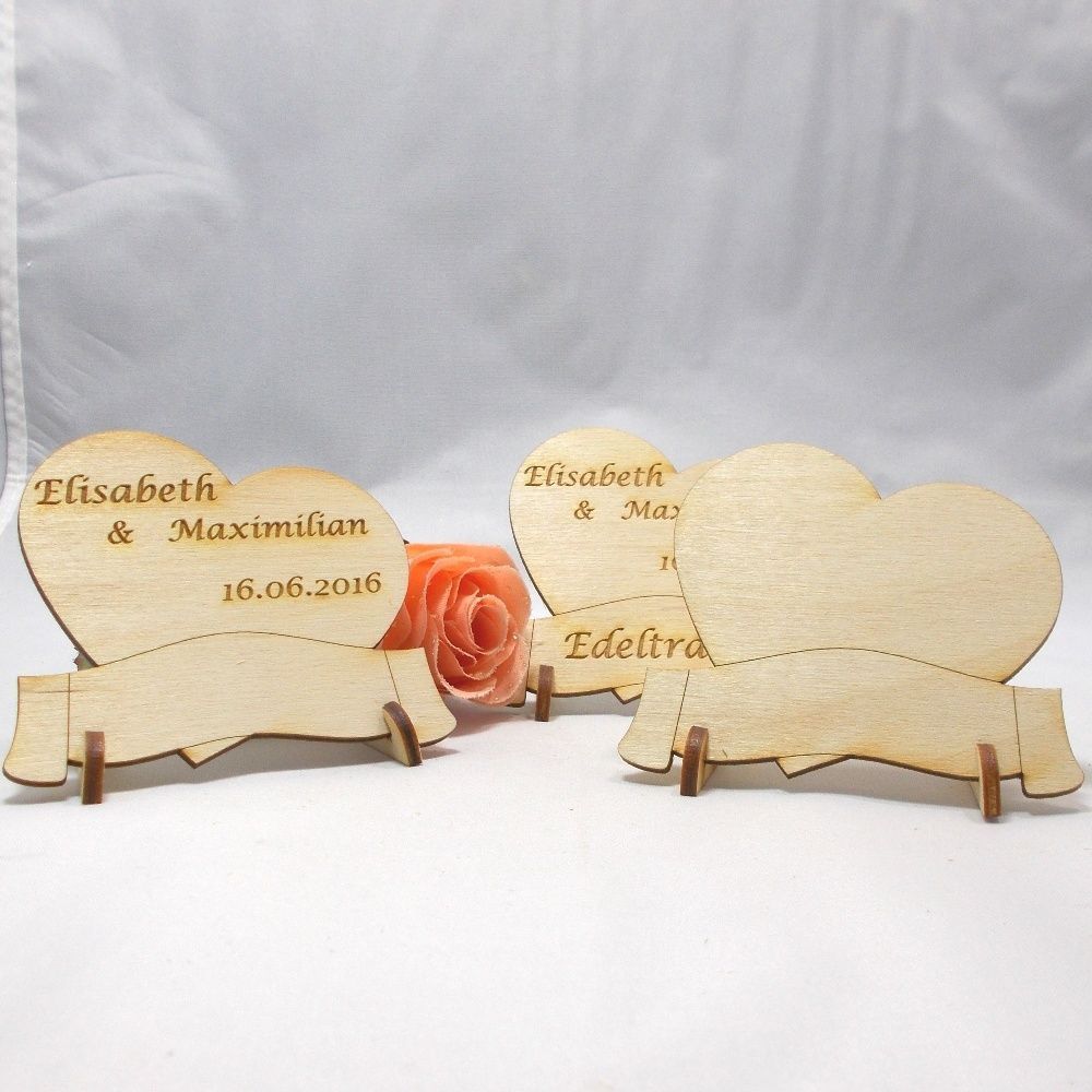 Namensschild aus Holz Banner Herz Blanko oder m. Gravur Hochzeit Gastgeschenk