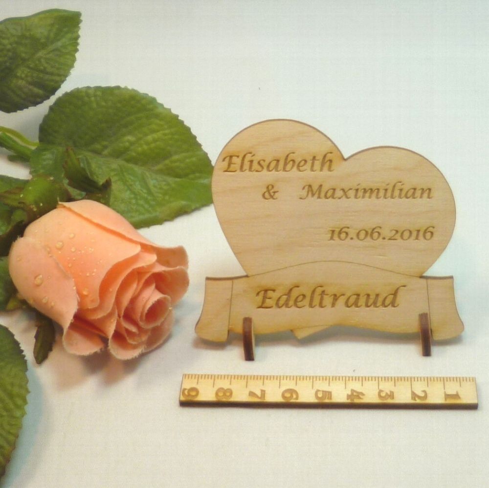 Wir bieten Ihnen hier die ideale Dekoration für viele Festlichkeiten! Namensschild Herz mit Banner und Ihrer gewünschten Gravur. Sie können selbst entscheiden, ob Sie die Tischkarte selbst beschriften oder durch uns gravieren lassen. Eine einheitliche Gravur bedeutet, auf mehreren Karten steht die g